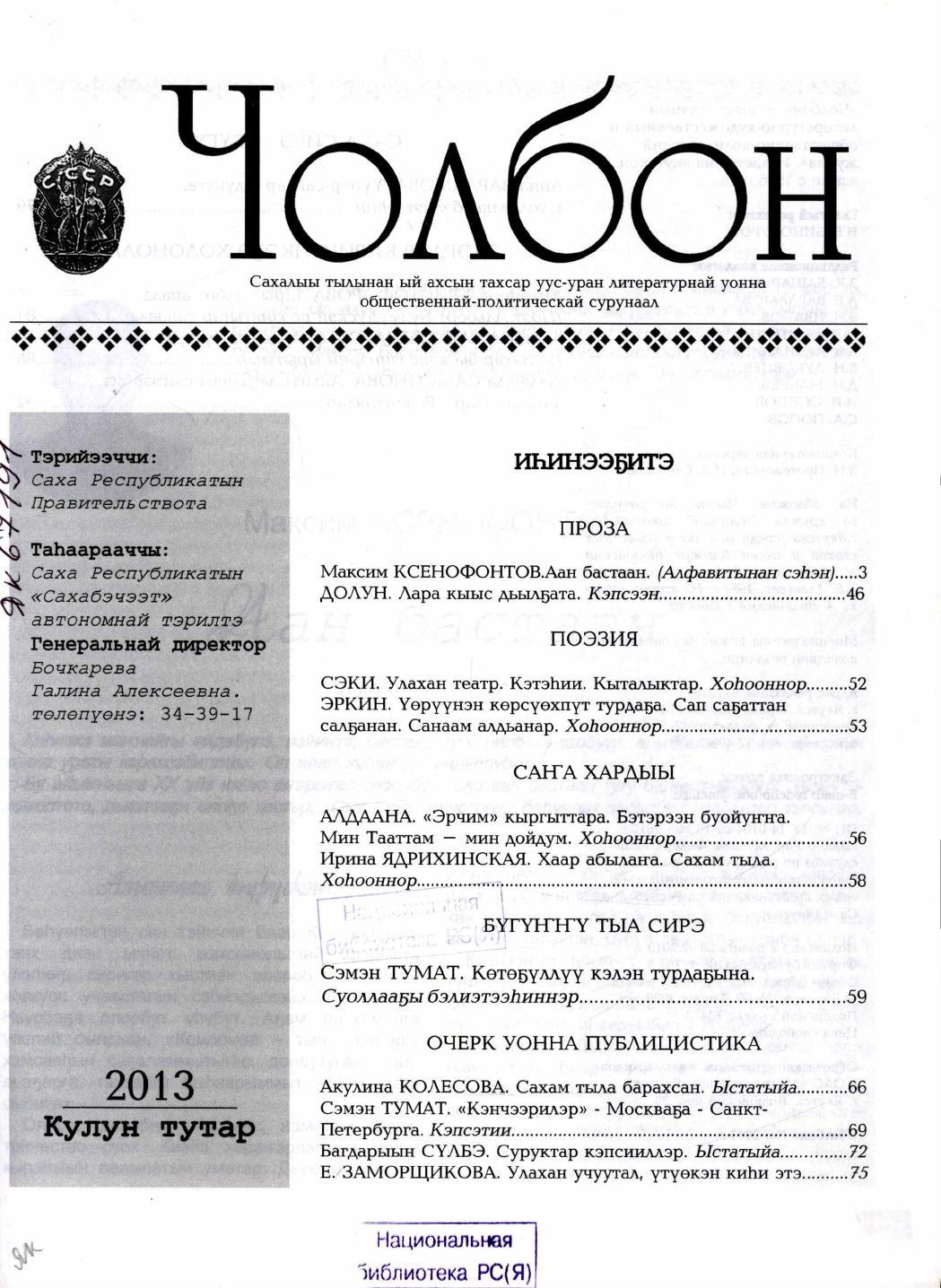 - 1. Чолбон: уус-уран литературнай уонна общественнай-политическай сурунаал, 2013, №1 (тохсунньу)