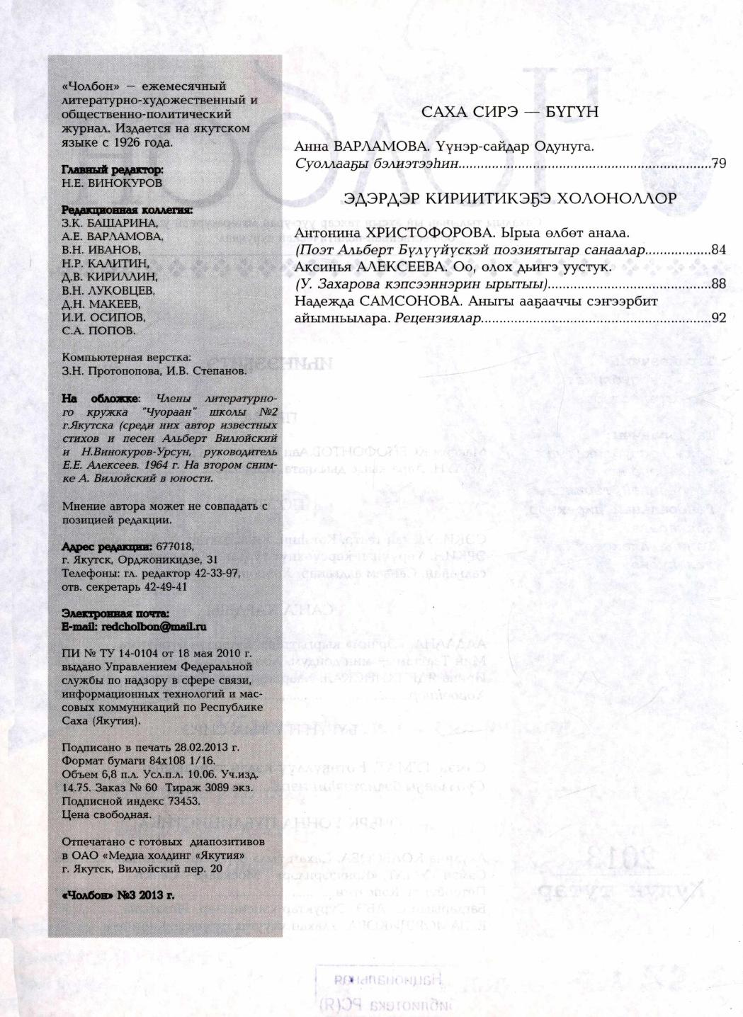 - 2. Чолбон: уус-уран литературнай уонна общественнай-политическай сурунаал, 2013, №2