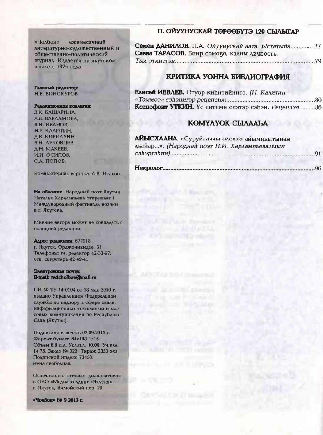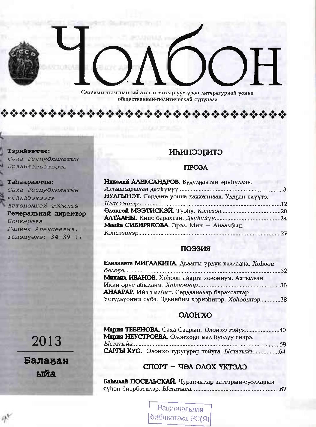 - 2. Чолбон: уус-уран литературнай уонна общественнай-политическай сурунаал, 2013, №2