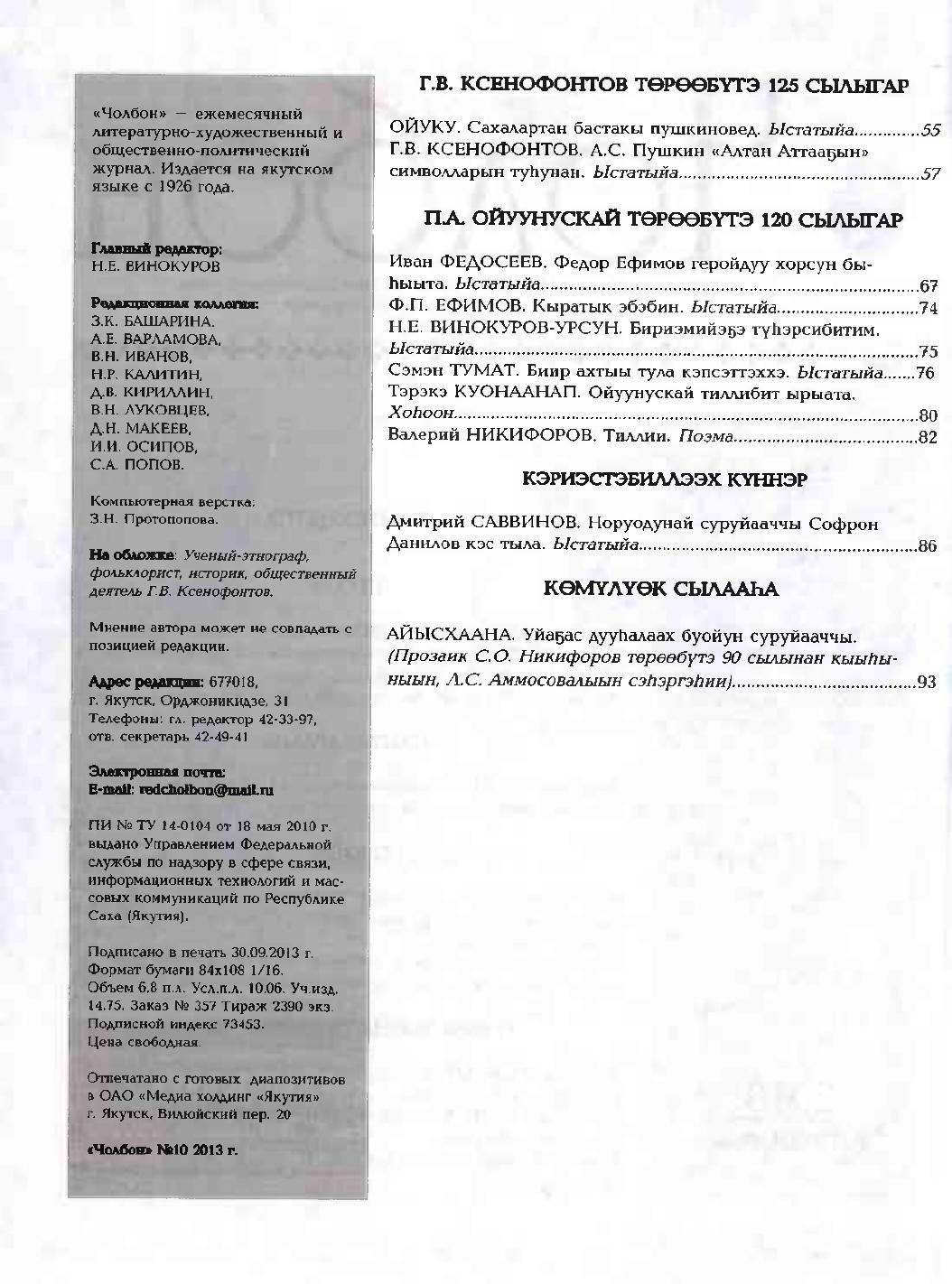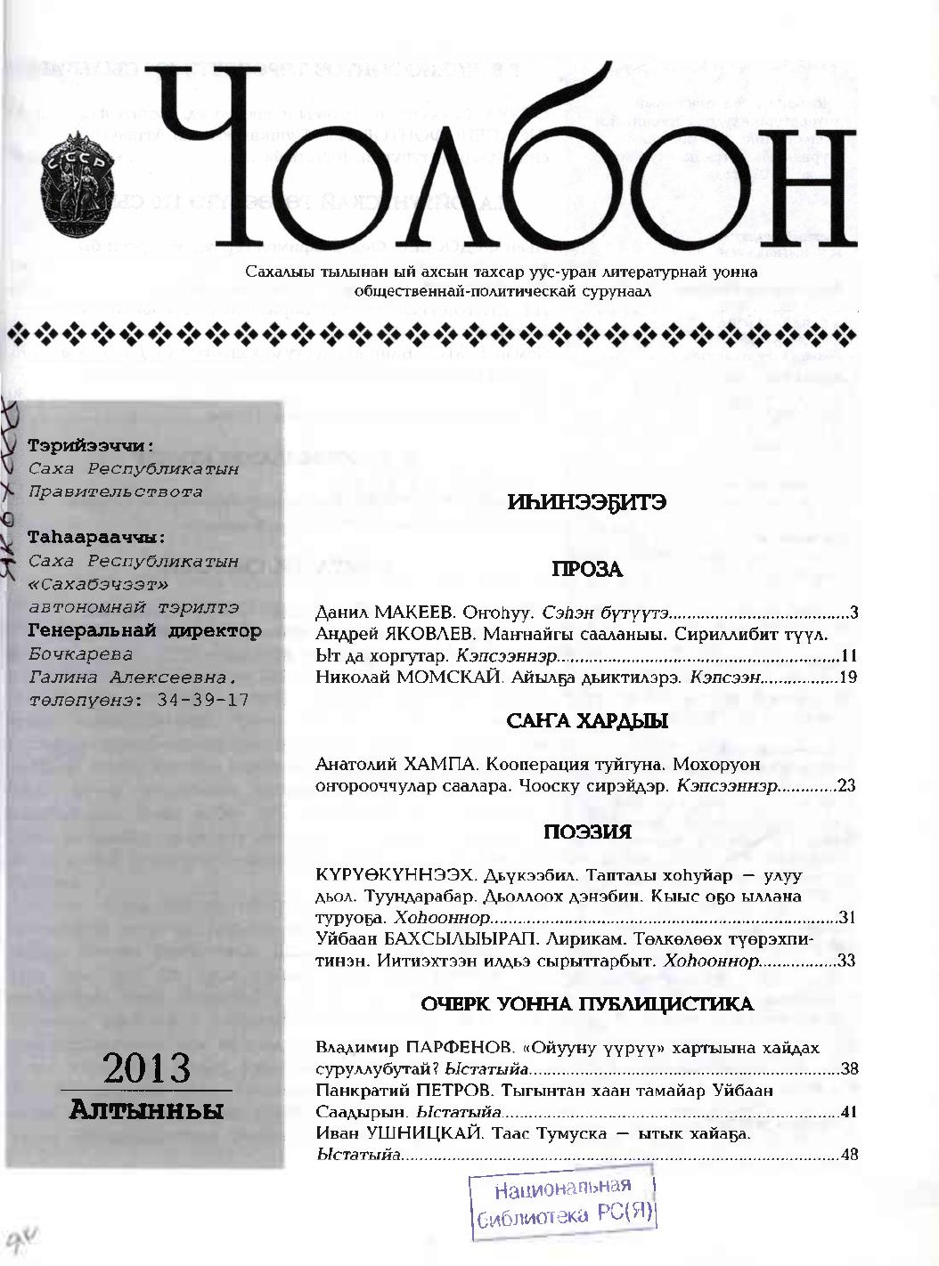 - 2. Чолбон: уус-уран литературнай уонна общественнай-политическай сурунаал, 2013, №2