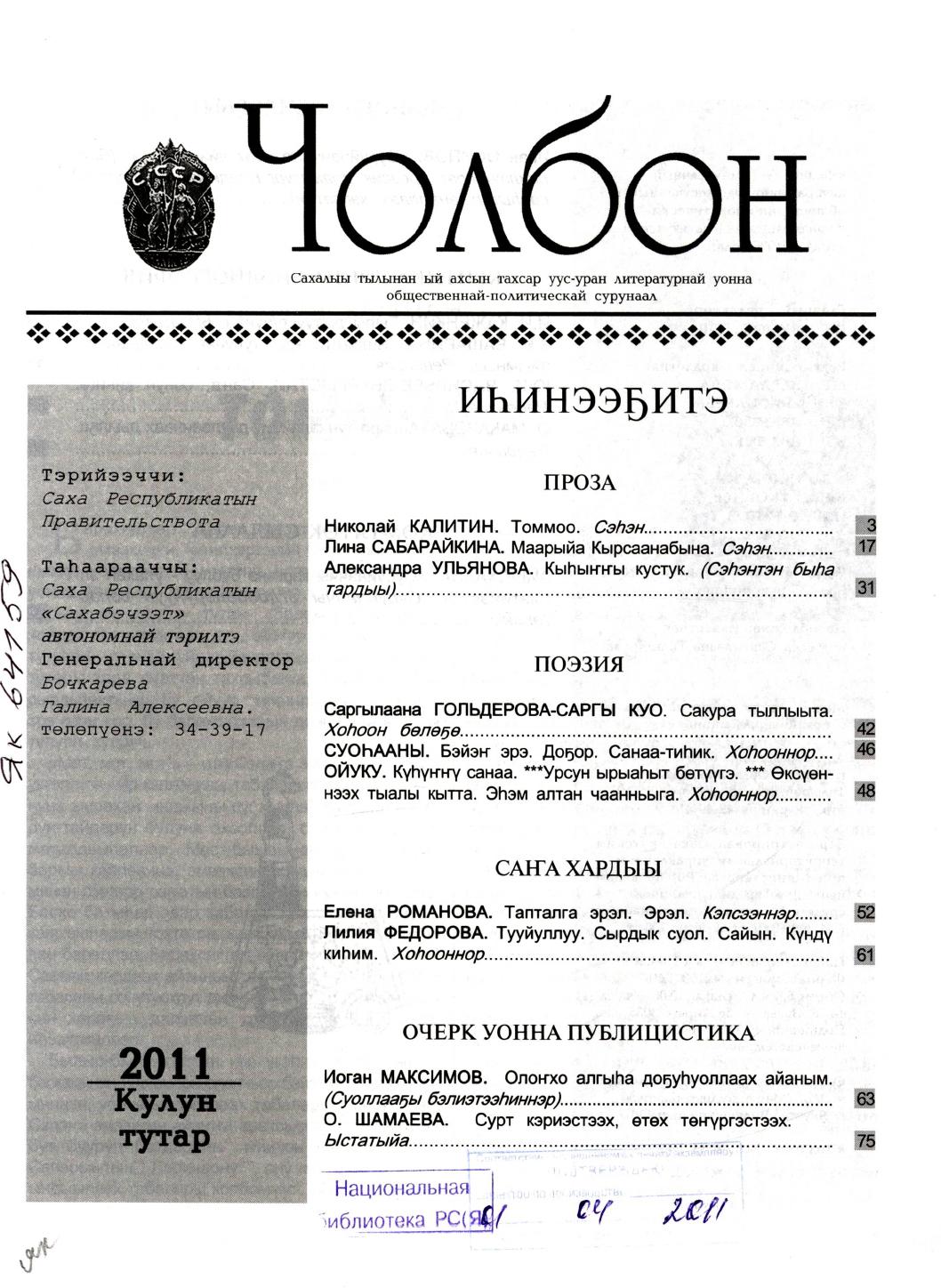 - 1. Чолбон: уус-уран литературнай уонна общественнай-политическай сурунаал, 2011, №1 (тохсунньу)