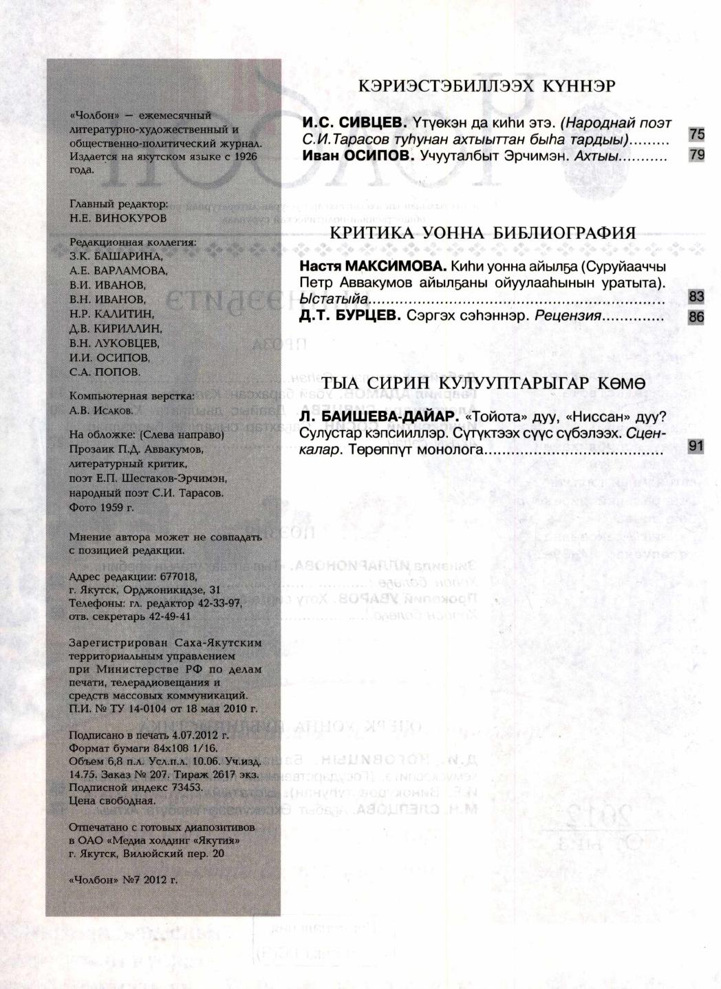 - 2. Чолбон: уус-уран литературнай уонна общественнай-политическай сурунаал, 2012, №2 (олунньу)