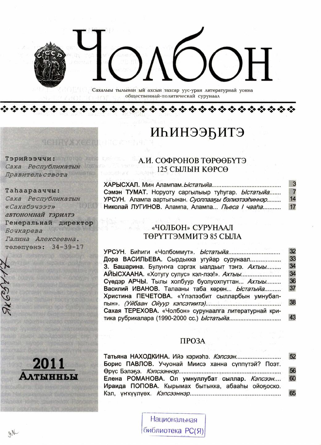 - 1. Чолбон: уус-уран литературнай уонна общественнай-политическай сурунаал, 2011, №1 (тохсунньу)