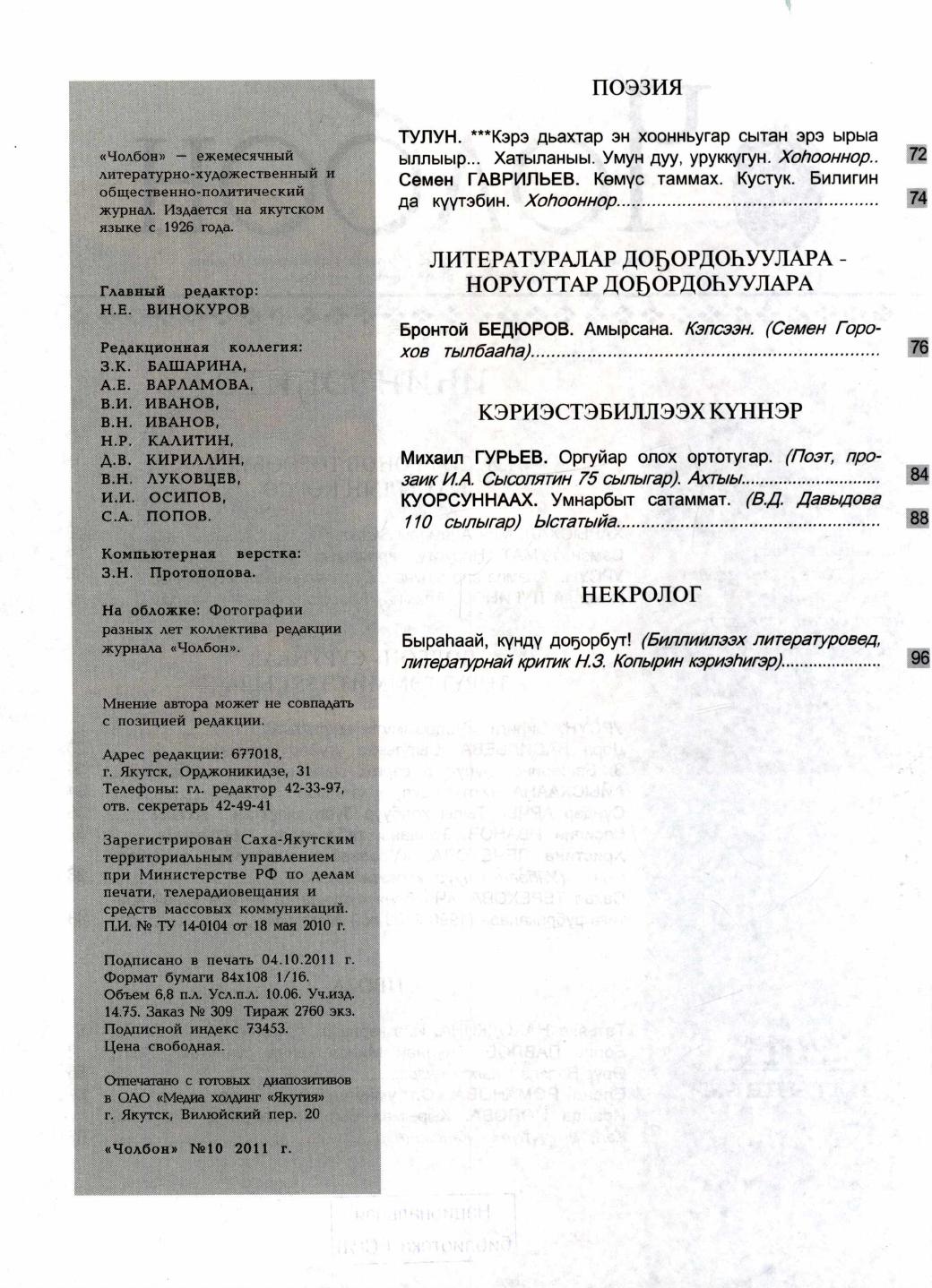 - 10. Чолбон: уус-уран литературнай уонна общественнай-политическай сурунаал, 2011, №11 (сэтинньи)