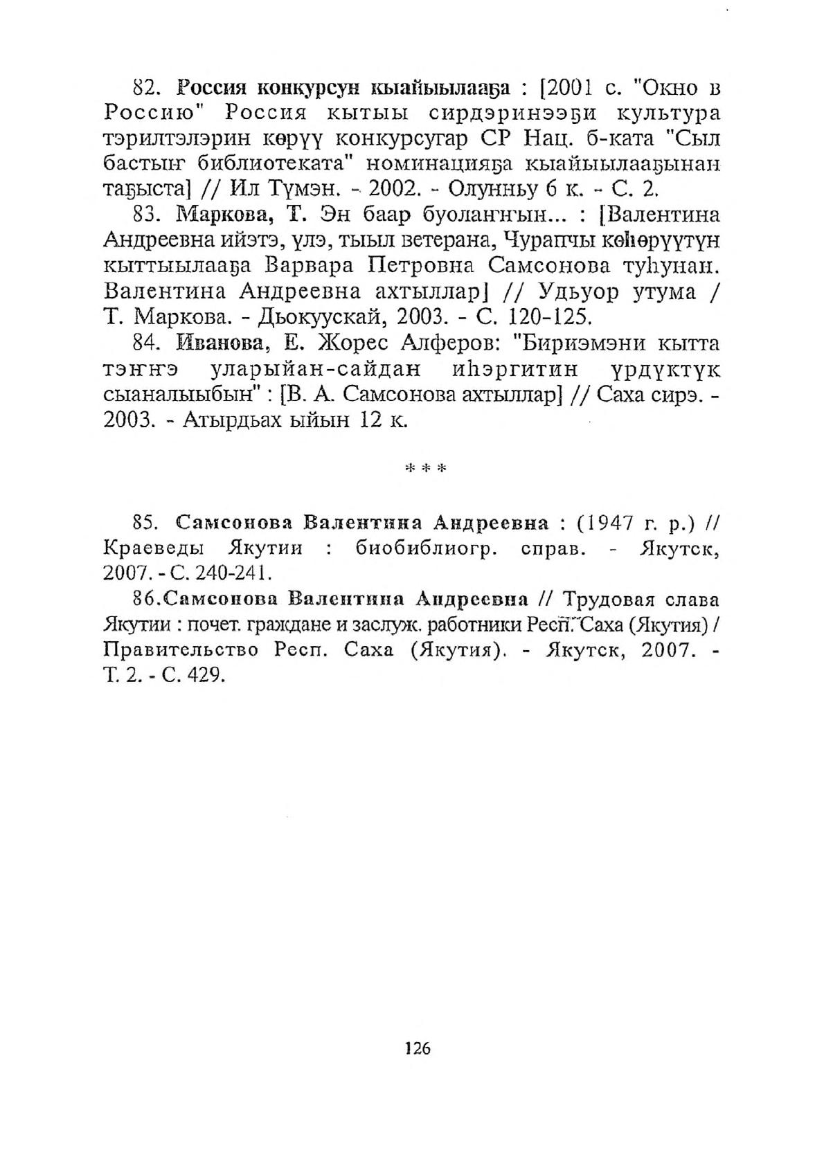 Национальная библиотека Республики Саха (Якутия): ракурс преобразований : статьи и доклады / В. А. Самсонова ; [редколлегия: О. И. Афанасьева и др.] ; Министерство культуры и духовного развития Республики Саха (Якутия), Национальная библиотека Республики Саха (Якутия), Арктический государственный институт культуры и искусств. - Якутск : [б. и.], 2007. - 126, [1] с.