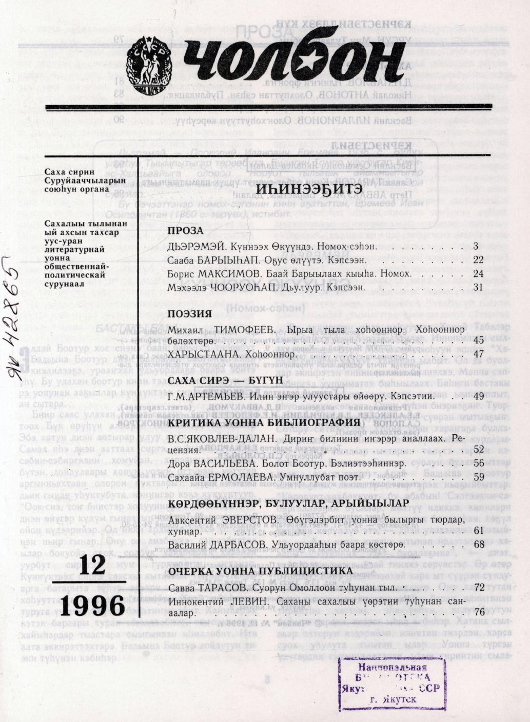 - 2. Чолбон: уус-уран литературнай уонна общественнай-политическай сурунаал, 1996, №2