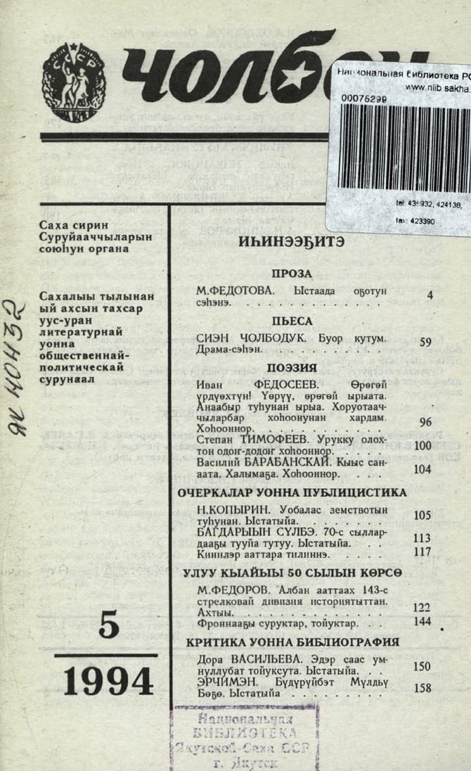 - 1. Чолбон: уус-уран литературнай уонна общественнай-политическай сурунаал, 1994, №1