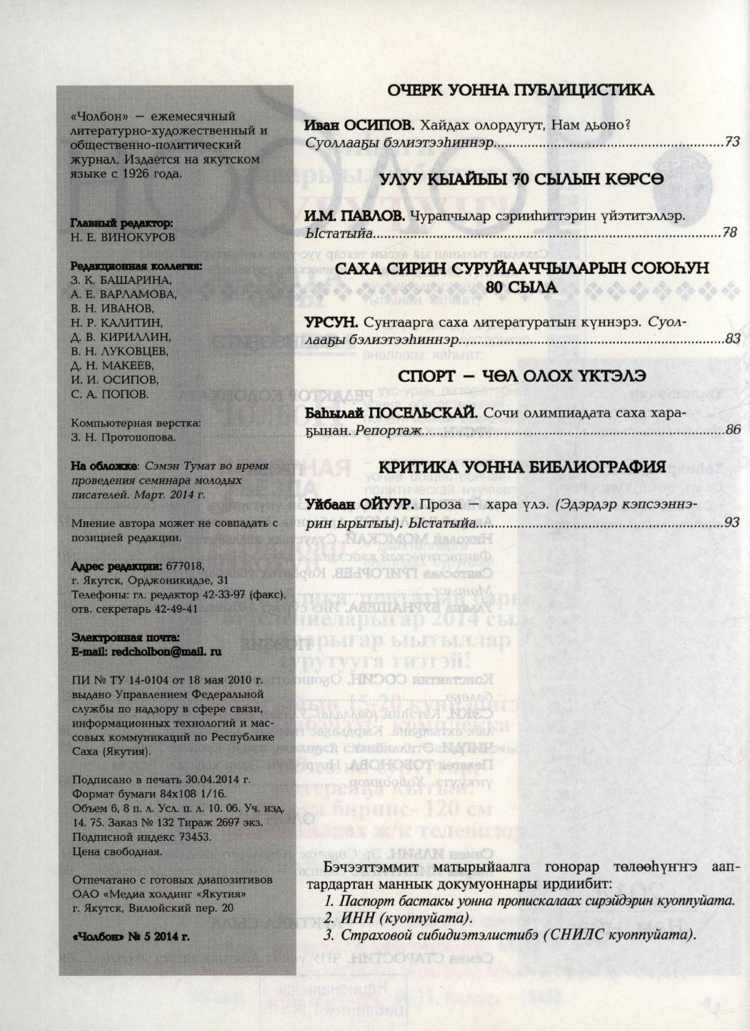 - 2. Чолбон: уус-уран литературнай уонна общественнай-политическай сурунаал, 2014, №2 (олунньу)
