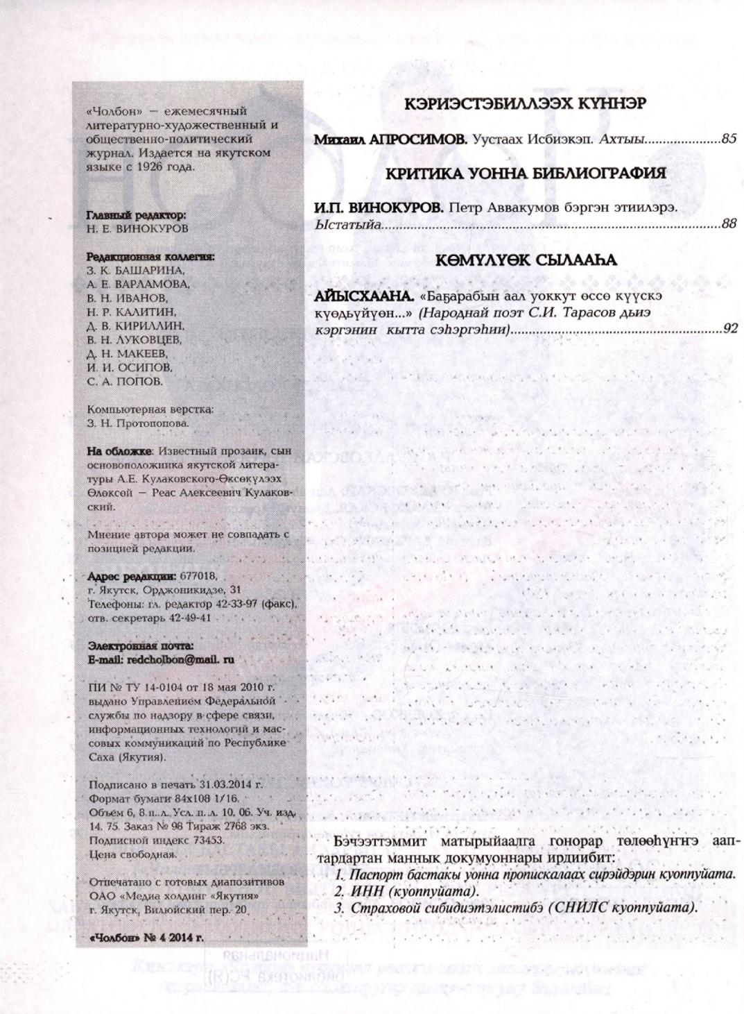 - 4. Чолбон: уус-уран литературнай уонна общественнай-политическай сурунаал, 2014, №5 (ыам ыйа)
