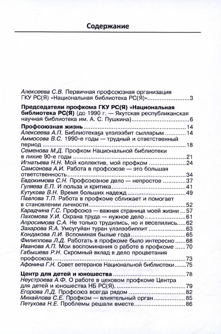 В книгу вошли воспоминания профсоюзных лидеров и активистов профкома Национальной библиотеки РС (Я) о деятельности профкома в прошлом и настоящем. Использованы материалы из Национального архива РС(Я) и фотографии из личных архивов