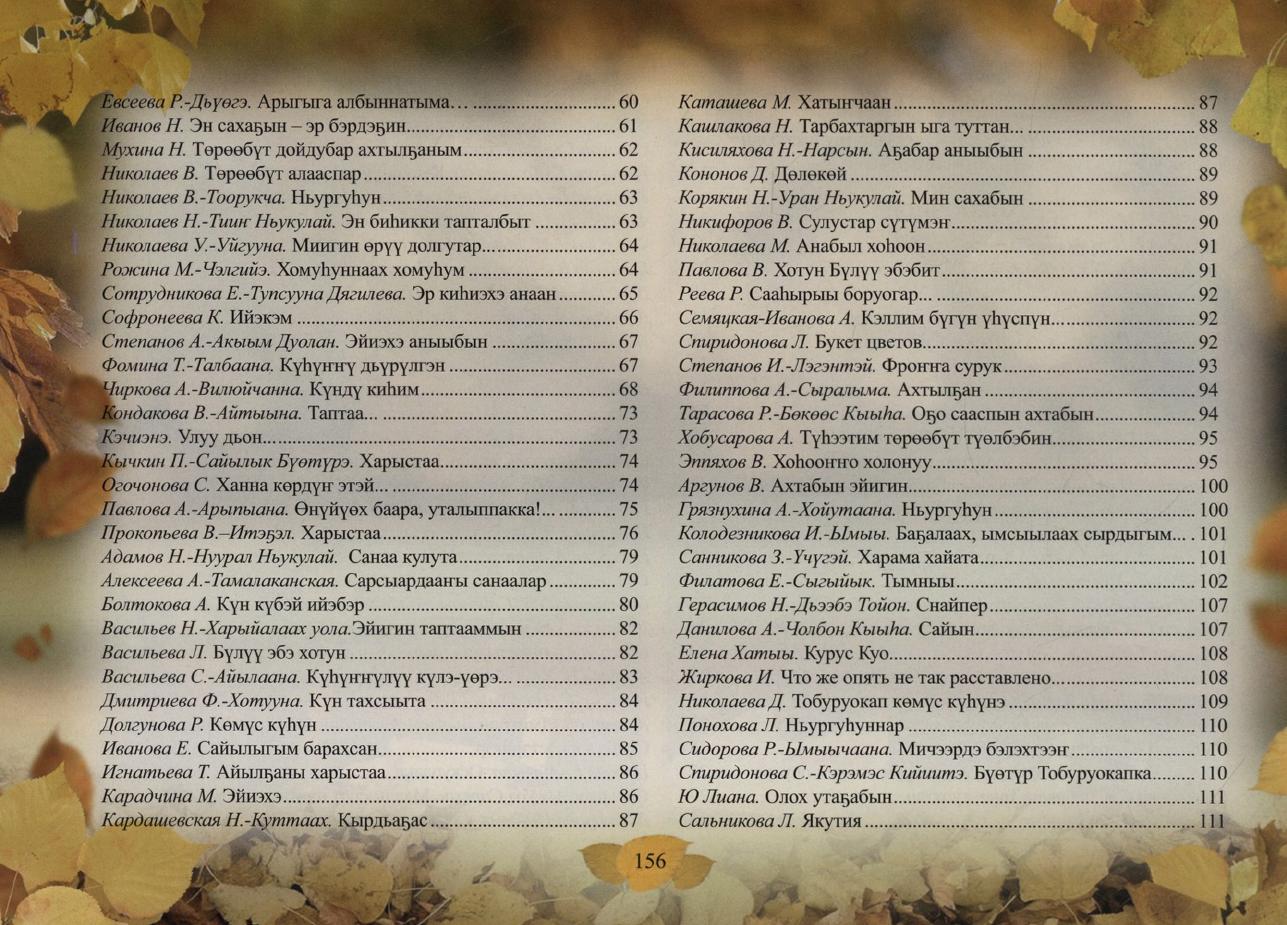 В сборник вошли стихотворения якутских поэтов, которые были прочтены на поэтических чтениях "Золотая осень Тобурокова" по традиции прошедших в селе Намцы Верхневилюйского улуса, а также статьи журналистов республики о проведенном мероприятии
