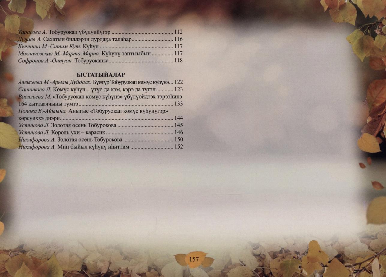 Тобуруокап көмүс күһүнэ-2017 / О. Д. Федорова аатынан Үөһээ Бүлүүтээҕи киин библиотека, "Нам нэһилиэгэ" муниципальнай тэриллии дьаһалтата ; хомуйан оҥордулар: Г. П. Саввинова, Г. А. Егорова ; бырайыак ааптара Д. Ф. Наумов. - Дьокуускай : Компания "Дани-Алмас", 2019. - 159 с.