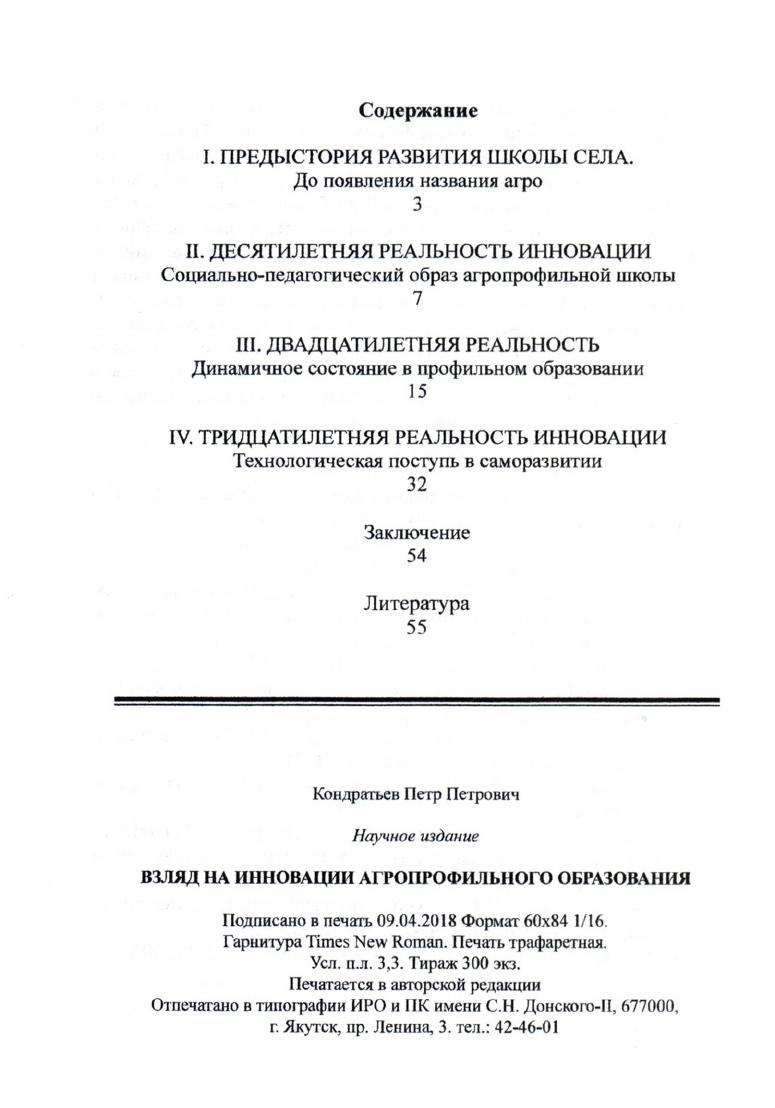 Взгляд на инновации агропрофильного образования / Кондартьев П. П. ; АОУ РС(Я) ДПО "Ин-т развития образования и повышения квалификации им. С. Н. Донского-II". - Якутск : Издательство "ИРОиПК им. С. Н. Донского-II", 2018. - 55 с.