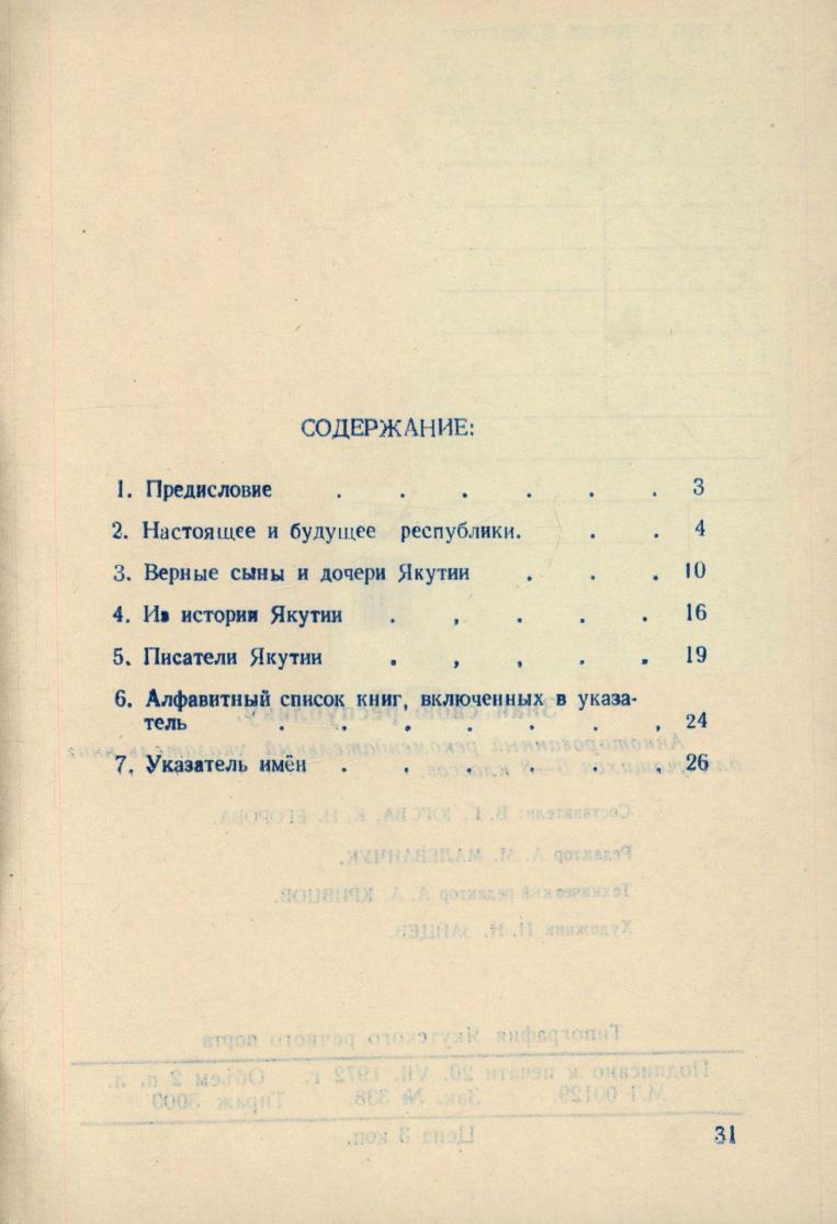 Знай свою республику : (библиографический указатель книг для учащихся 6-8 классов / Якутская республиканская детская библиотека ; [составители: В. Г. Югова, К. Н. Егорова ; редактор А. М. Малеванчук]. - Якутск : Типография Якутского речного порта, 1972. - 31 с.