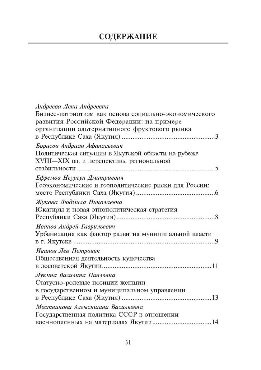 Сборник тезисов конференции "Политический процесс в Республике Caxa (Якутия): современное состояние и тенденции развития" посвящен актуальным вопросам современных гуманитарных исследований, проводимых учеными, аспирантами и студентами в Республике Caxa (Якутия). В нем отражены результаты работы научно-практической конференции, состоявшейся 27 февраля 2020 года на историческом факультете СВФУ имени М.К. Аммосова. В работах участников конференции рассмотрены геополитический статус Республики Caxa (Якутия) и связанные с этим экономические особенности. Серьезное внимание было уделено вопросам местного самоуправления, его институциональным и социально-экономическим характеристикам. Особенный интерес вызывают исследования, посвященные политической истории республики. Здесь новой страницей стало изучение политической истории XX века, связанной с историей BOB и современной историей республики. Большой интерес представляют тезисы, посвященные государственной национальной политике, прозвучали наиболее злободневные вопросы, касающиеся коренных малочисленных народов Севера и проблем мигрантов. Ряд работ выполнен по тематике политической культуры и взаимодействия власти со СМИ. Данная тема представляется наиболее актуальной в свете важности коммуникации в жизни современного человека. Авторами были затронуты такие проблемы, как развитие культуры в современном российском обществе, а также роль отдельных политических лидеров во взаимодействии со СМИ. Сборник имеет научно-практическое значение, наглядно характеризует современную проблематику исследований в области политических, социальных и гуманитарных наук