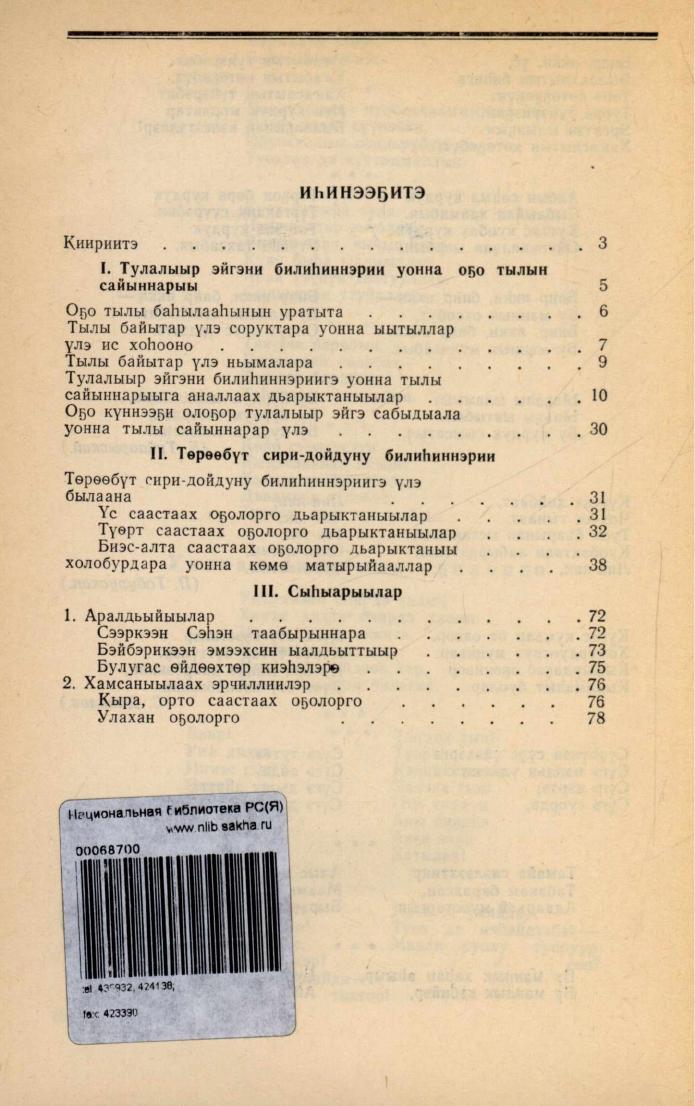 Тулалыыр эйгэни билиһиннэрии уонна оҕо тылын сайыннарыы : оҕо садыгар иитээччилэри бэлэмниир педучилище үөрэнээччилэригэр / М. Н. Саввина. - 1-гы тахсыыта. - Дьокуускай : Саха сиринээҕи кинигэ издательствота, 1992. - 78, [2] с.