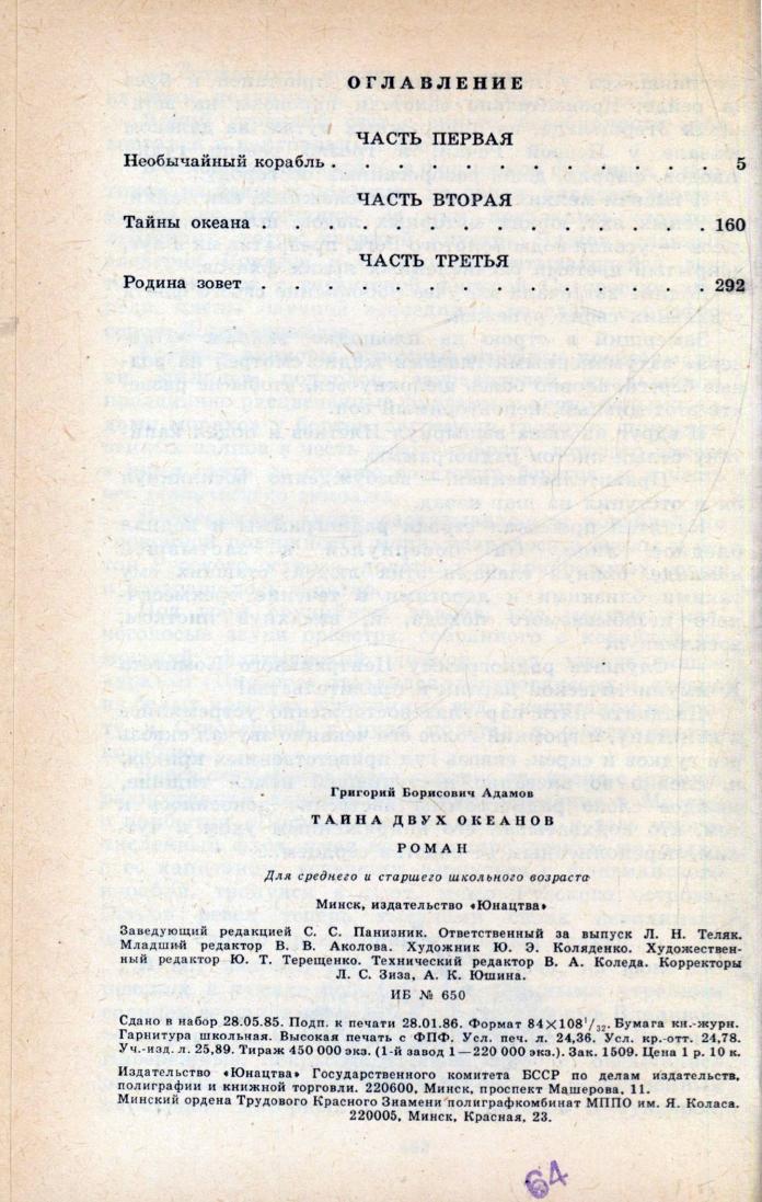 Тайна двух океанов : роман : для среднего и старшего школьного возраста / Григорий Адамов ; художник Ю. Э. Коляденко. - Минск : Юнацтва, 1986. - 462, [2] с.
