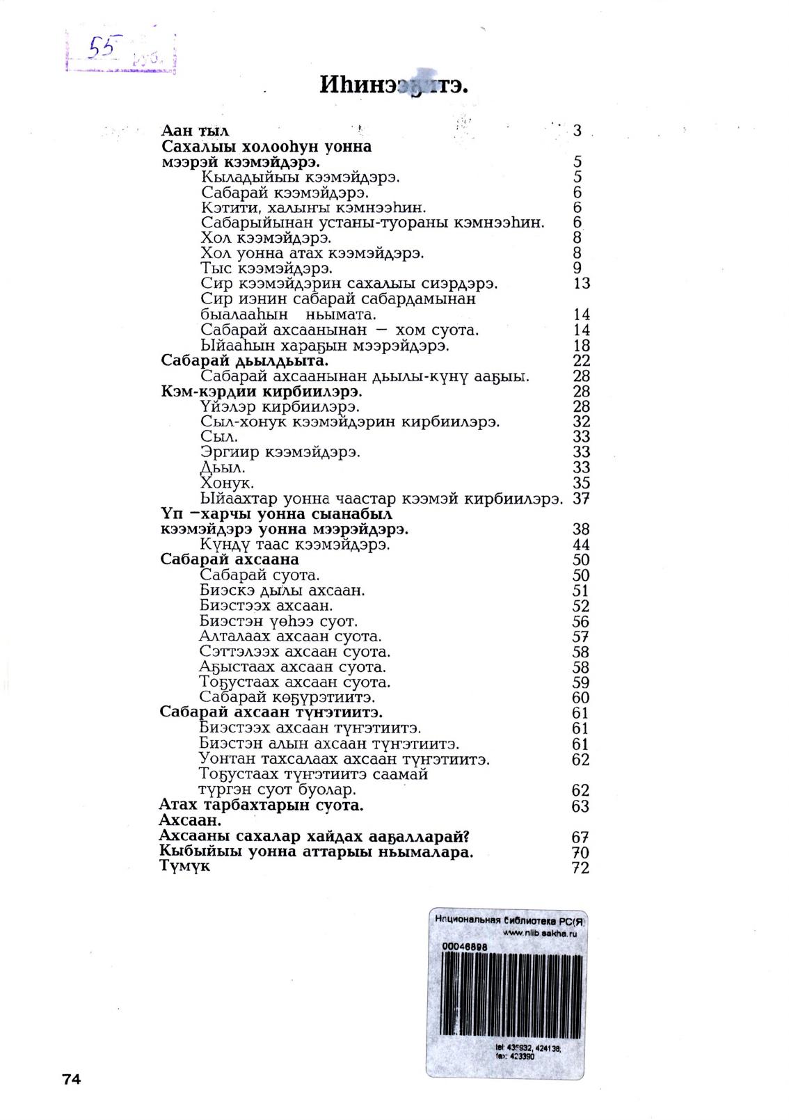 Сабарай ахсаана : [сахалыы мээрэйдэр, кээмэйдэр, ахсаан : үөрэнээччилэргэ, учууталларга, төрөппүттэргэ көмө] / Тумус Мэхээлэ, Бааһынай Баһылай ; [А. Архипов ойуулара ; аан тыл ааптара В. Д. Михайлов] ; "Сайдам санаа" общественнай Академия. - Дьокуускай : [и. с.], 1999. - 74 с.