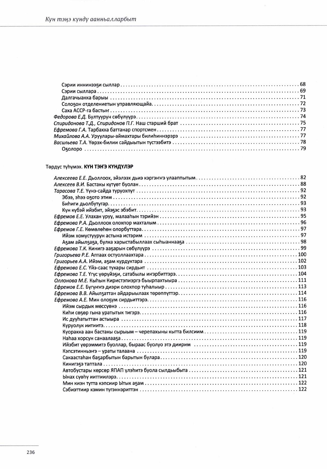 Күн тэҥэ күндү аанньалларбыт : Горнай улууһун Солоҕон нэһилиэгин ытык ыала Ефремовтар / хомуйан оҥордулар: А. Е. Ефремова, Т. Е. Ефремова, Е. Е. Алексеева, Т. Е. Тарасова ; редактор В. И. Алексеев. - Бэрдьигэстээх : [и. с.], 2020. - 239 с., [18] л. ил.
