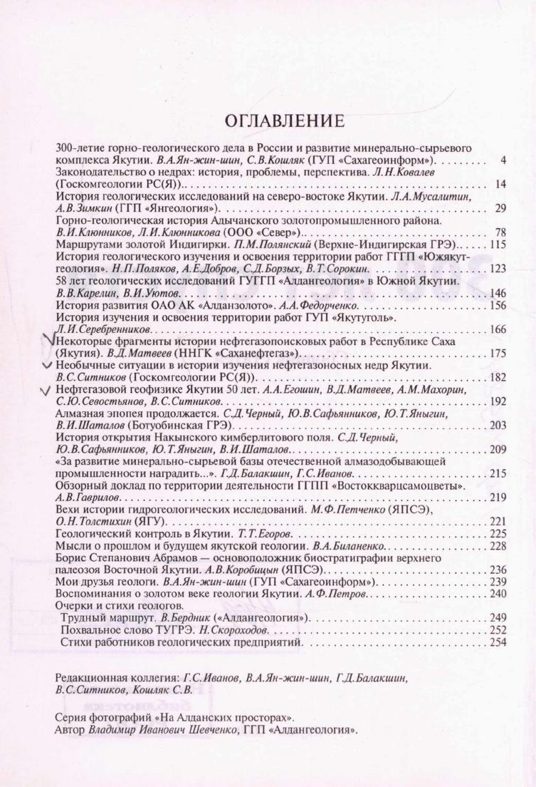 В сборнике, посвященном 300-летию горно-геологической службы России, рассматривается история геологических исследований и горного дела в Якутии. В сборнике материал представлен геологическими и горнодобывающими предприятиями, действующими в нашей республике, а также ценны воспоминания ветеранов