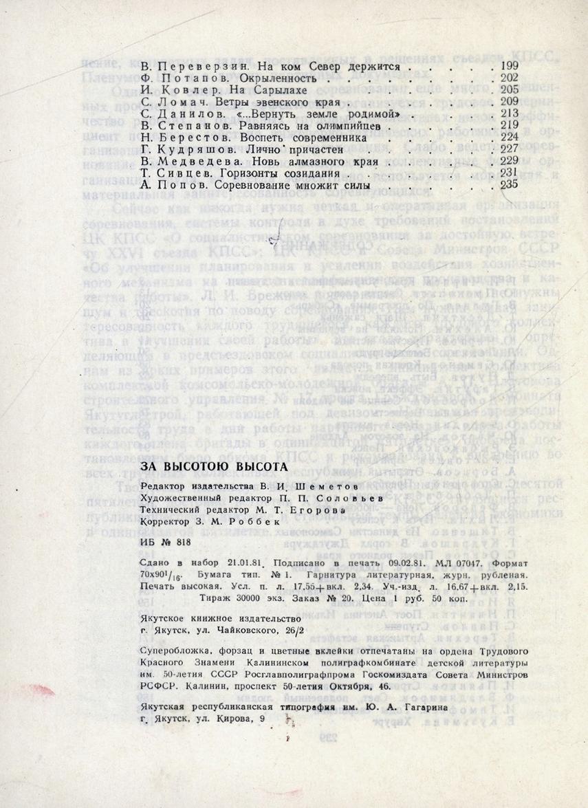 За высотою высота : [сборник / редколлегия: А. А. Попов, Д. В. Кириллин, О. Д. Якимов ; составители: Д. И. Пухов, Ю. А. Чертов]. - Якутск : Якутское книжное издательство, 1981. - 239, [1] с.