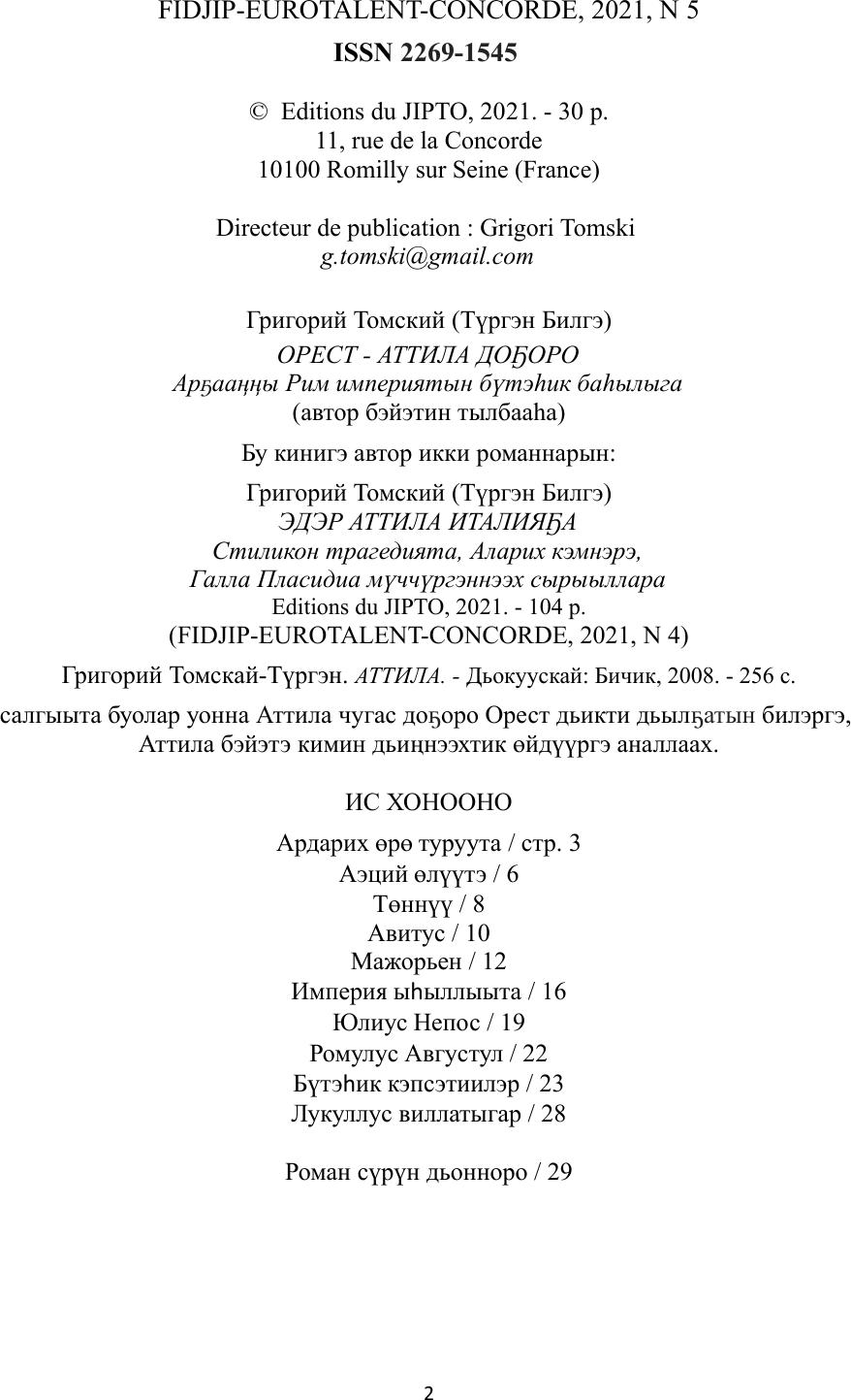 Орест - Аттила доҕоро = The friends of Attila : Арҕааҥҥы Рим империятын бүтэһик баһылыга : роман : автор бэйэтин тылбааһа / Григорий Томский (Түргэн Билгэ). - [Париж : и. с.], 2021. - 1 файл (30 с. ; 1 Мб).