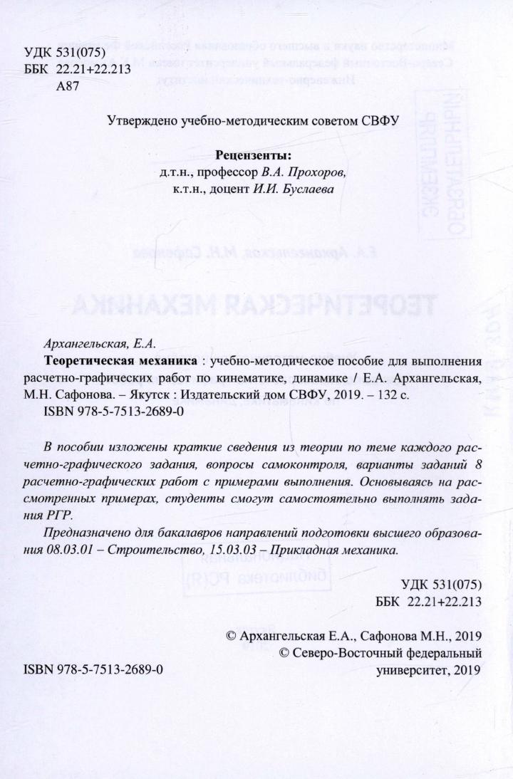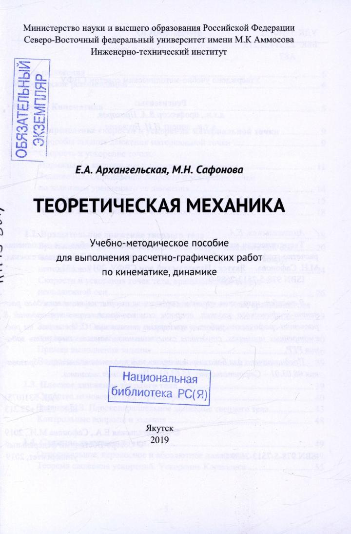 Архангельская, Е. А. Теоретическая механика : учебно-методическое пособие для выполнения расчетно-графических работ по кинематике, динамике / Е. А. Архангельская, М. Н. Сафонова ; рецензенты: В. А. Прохоров, И. И. Буслаева ; Министерство науки и высшего образования Российской Федерации, Северо-Восточный федеральный университет имени М. К. Аммосова, Инженерно-технический институт. – Якутск : Издательский дом СВФУ, 2019. – 131 с. : ил. – ISBN 978-5-7513-2689-0