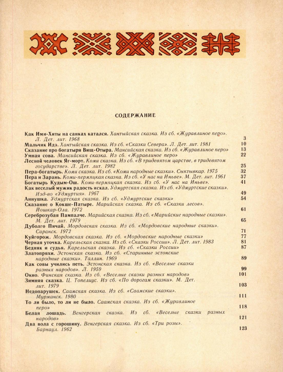 Этот сборник состоит из двадцати четырех сказок финно-угорских народов — ханты, манси, коми-пермяков, коми, удмуртов, мордовцев, марийцев, карелов, финнов, саамов, эстонцев, венгров. Сказки объединены одной общей идеей: они рассказывают о народной мудрости и смекалке; высмеивают человеческие пороки, показывают, что добро сильнее зла и справедливость всегда берет верх