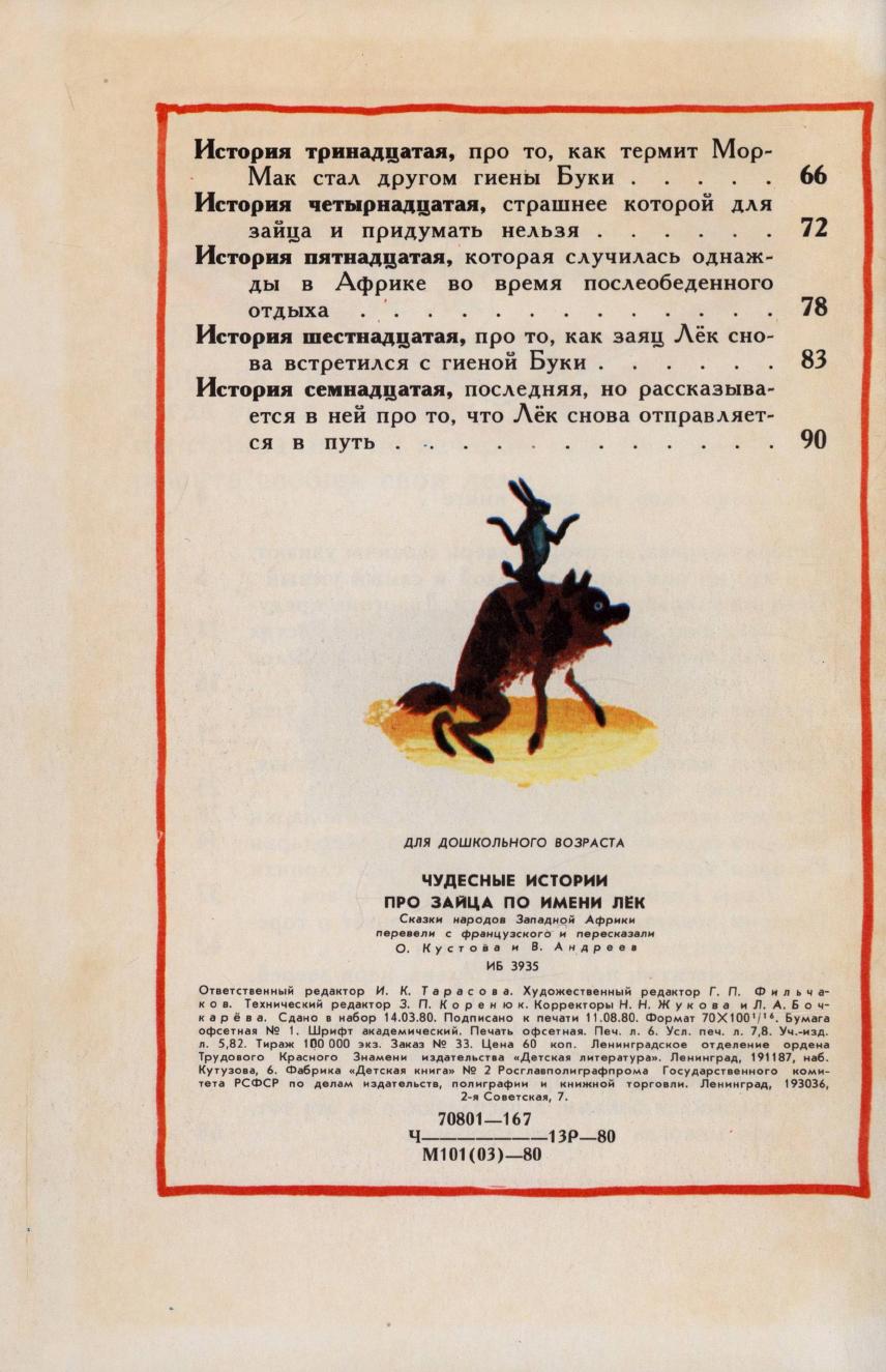 Чудесные истории про зайца по имени Лек : сказки народов Западной Африки : [для дошкольного возраста] / перевели с французского и перссказали: О. В. Кустова и В. Андреев ; рисунки Т. Чурсиновой. - Ленинград : Детская литература, Ленинградское отделение, 1980. - 96 с.