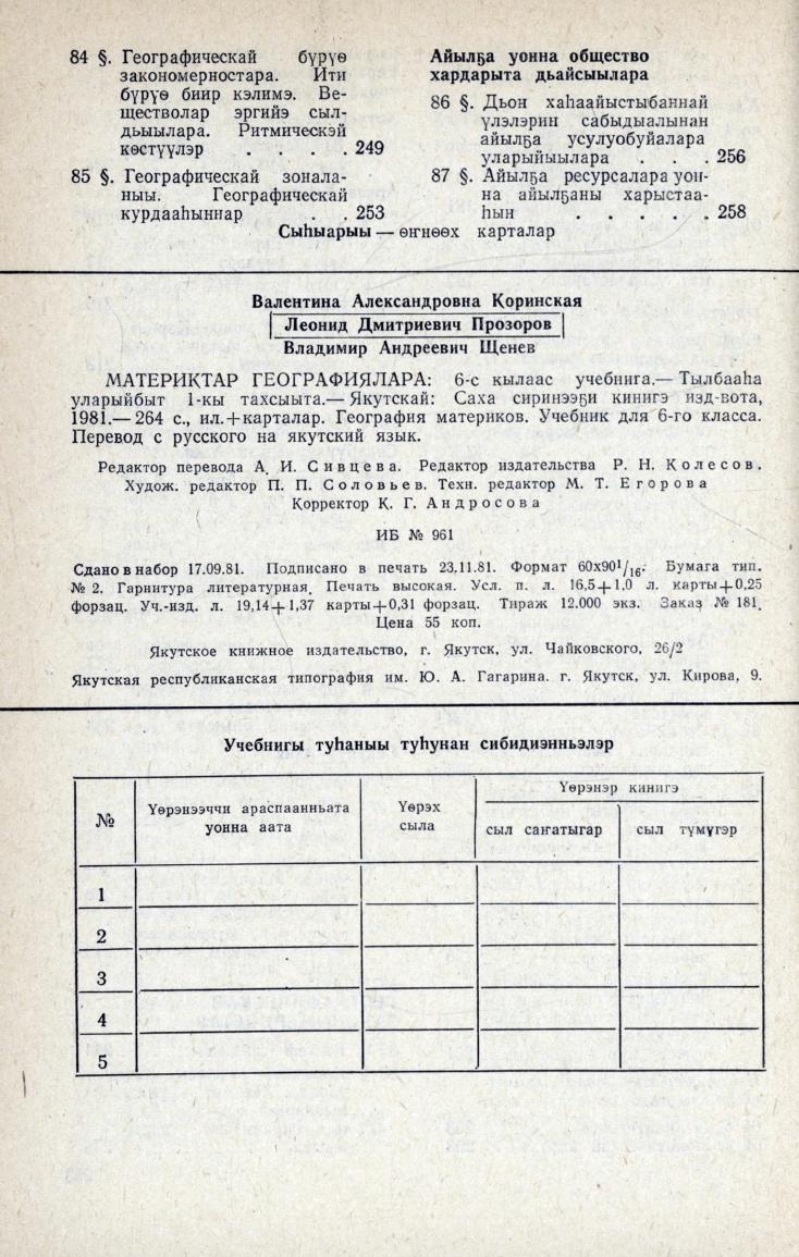 Материктар географиялара : 6-с кылаас учебнига / В. А. Коринская, Л. Д. Прозоров, В. А. Щенев. - 13-с тахс. - Якутск : Кинигэ издательствота, 1981. - 264 с.