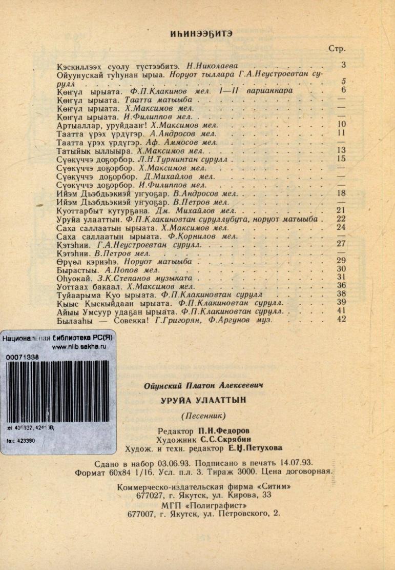 Уруйа улааттын : [ырыанньык] / Платон Ойуунускай ; [муз. ред. З. К. Степанов ; нотирование П. П. Стручкова ; киирии тыл авт. Н. Николаева, иск. к.] ; Саха Респ. культураҕа м-вота уонна композитордарын союһа. - Дьокуускай : Ситим, 1993. - 47, [1] с.