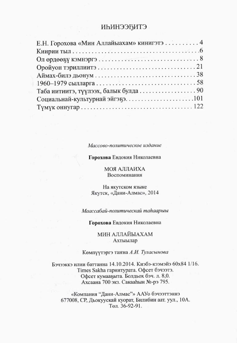 Мин Аллайыахам : (ахтыылар) / Е. Н. Горохова ; [эрэдээктэр С. Н. Горохов]. - 2-с тахсыыта, көннөрyyлээх. - Дьокуускай : Дани-Алмас, 2014. - 127, [1] с., [18] л. ил., портр.
