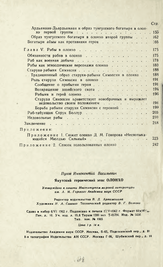 Якутский героический эпос олонхо : основные образы / И. В. Пухов ; [отв. ред. Е. М. Мелетинский ; Акад. наук СССР, Ин-т мир. лит. им. А. М. Горького, Ин-т яз., лит., истории Якут. фил. Сиб. отд-ния АН СССР]. - Москва : Изд-во АН СССР, 1962. - 255, [1] с.