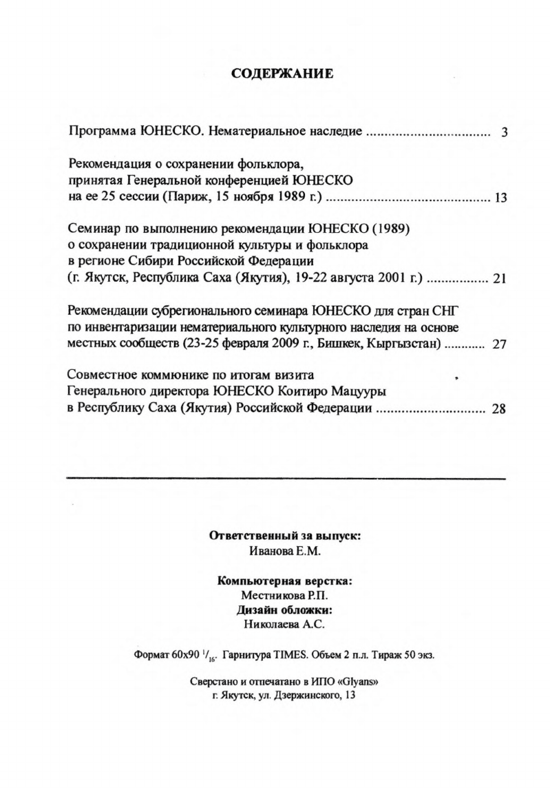 Материалы по инвентаризации нематериального культурного наследия / Дом дружбы народов - республиканский Центр культуры и традиционного художественного творчества им. А. Е. Кулаковского, Республиканский центр олонхо ; [составитель А. Е. Захарова]. - Якутск : GLYANS, 2009. - 31 с.