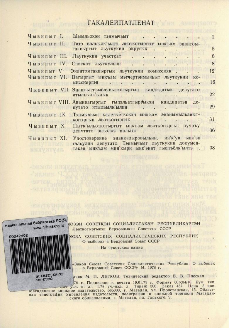 Законы. Закон Союзэн Советкэн Социалистакэн Республикаргэн льоткогыргыкэн Верховныкэн Советэты СССР : гэпирилин вама к'онъачгынк'ав сессия Верховныкэн Советэн СССР к'онъачгынк'авкэн ромакаквырга 6 июлык 1978 г. / [ред.-пер. М. П. Легков]. - Магадан : Книжное изд-во, 1979. - 38, [2] с.