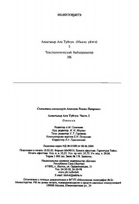 Алаатыыр Ала Туйгун : үс үйэлээх олоҥхо / Саха Республикатын наукаларын академията, Гуманитарнай чинчийии института, "Олоҥхо" ассоциацията ; [олоҥхоһут Р. П. Алексеев тыллыттан А. Р. Алексеева, В. И. Федоров суруйдулар ; эппиэттиир редактор В. В. Илларионов ; Т. А. Степанов, В. С. Карамзин уруһуйдара туттулунна]. - Дьокуускай : Бичик, 2002. - 20 см. - (Саха боотурдара : 21 томнаах ; Т. 1). "Алаатыыр Ала Туйгун", записанный со слов олонхосута Р. П. Алексеева представляет один из лучших и полных текстов эпического наследия народа саха. Сюжет олонхо раскрывает непримиримую борьбу богатырей айыы трех поколений: Кыыс Нюргун, Ала Туйгун, Дьуруо Беге, защитников племени айыы аймага. Олонхо насыщен поэтическим языком, богат изобразительно-художественными описаниями. Книга предназначена фольклористам, этнографам, студентам, а также тем, кто интересуется эпическим наследием народа саха. Т. 1: Иккис үйэтэ. - 398, [1] с.