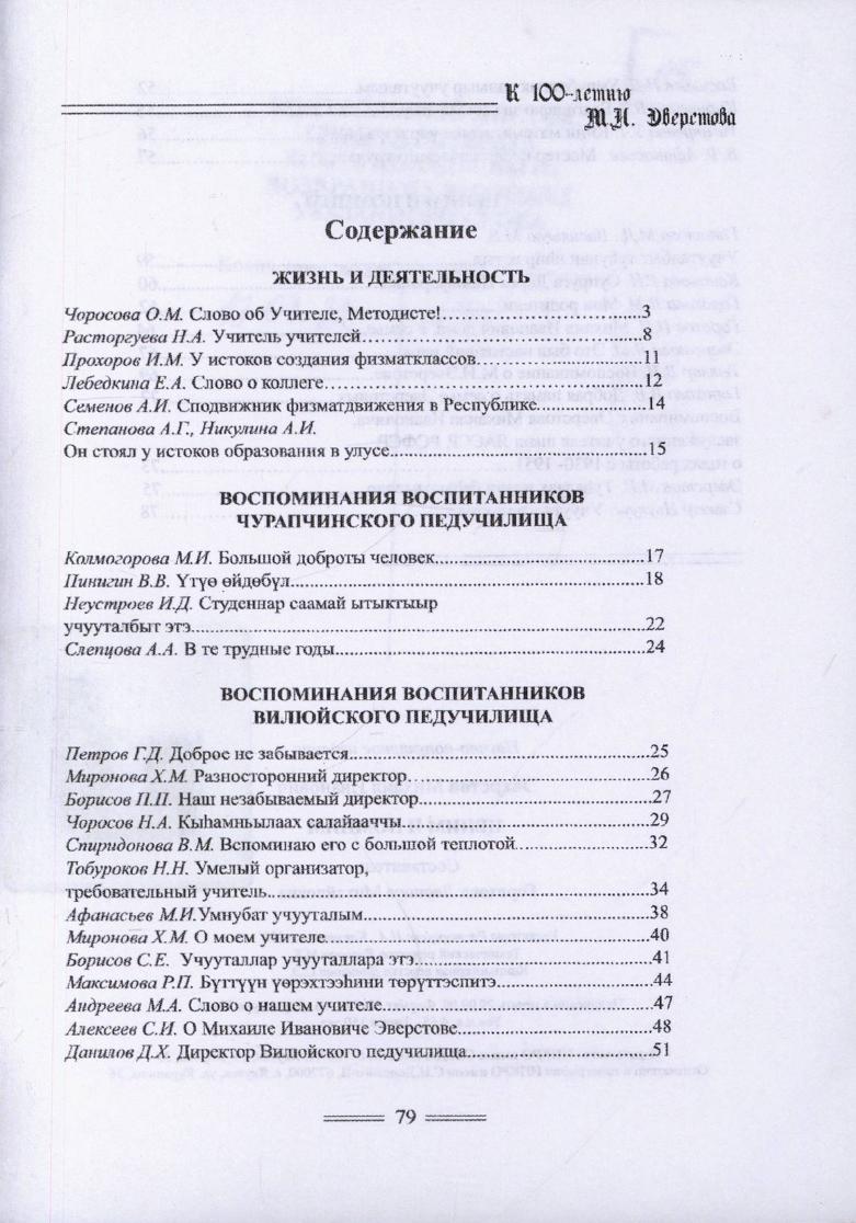 Книга посвящена 100-летию Михаила Ивановича Эверстова, заслуженного учителя ЯАССР и РСФСР, отличника народного образования, зачинателя методической службы преподавания физики и математики, почетного гражданина Момского района. В сборник вошли воспомнания его коллег, учеников, друзей и родственников