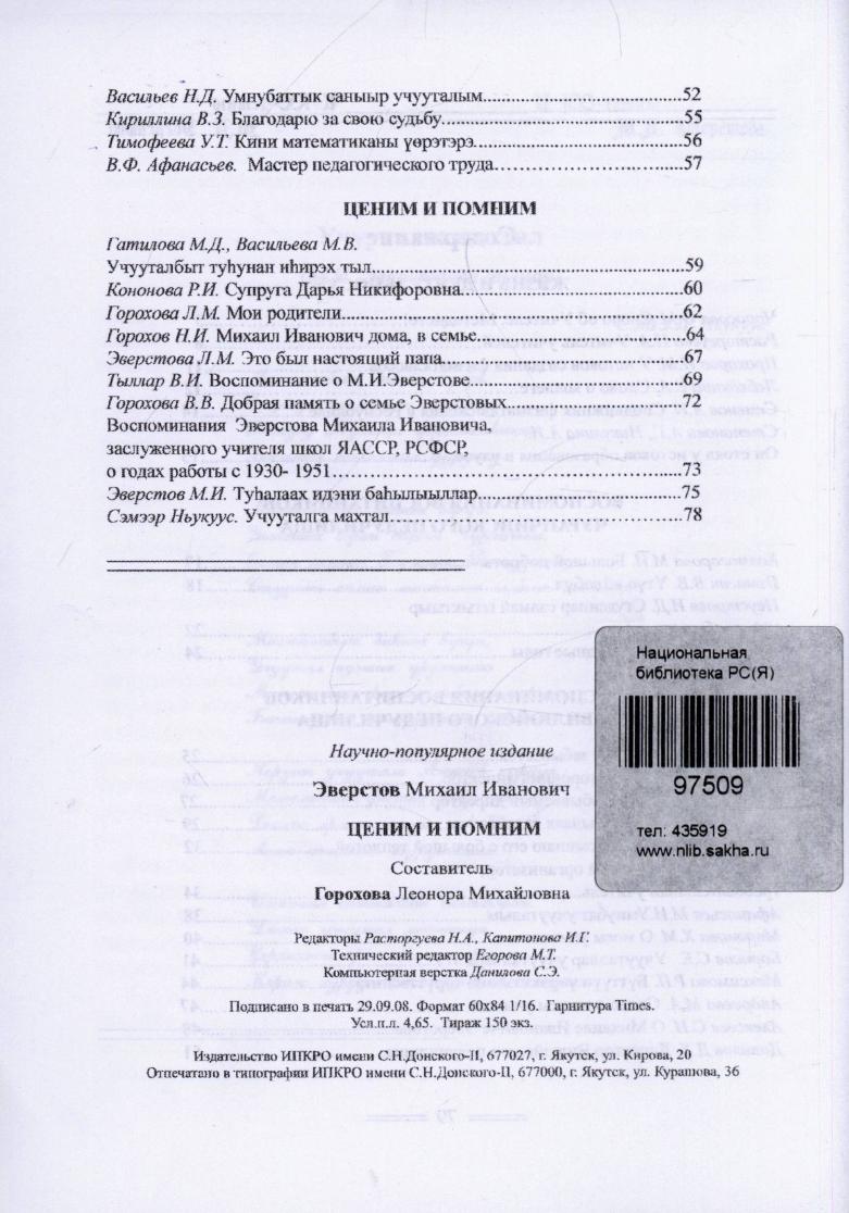 Михаил Иванович Эверстов. Ценим и помним / Институт повышения квалификации работников образования им. С. Н. Донского-II ; [составитель Л. М. Горохова ; автор вступительной статьи О. М. Чоросова]. - Якутск : Издательство ИПКРО, 2008. - 79, [1] с., [6] л. ил.
