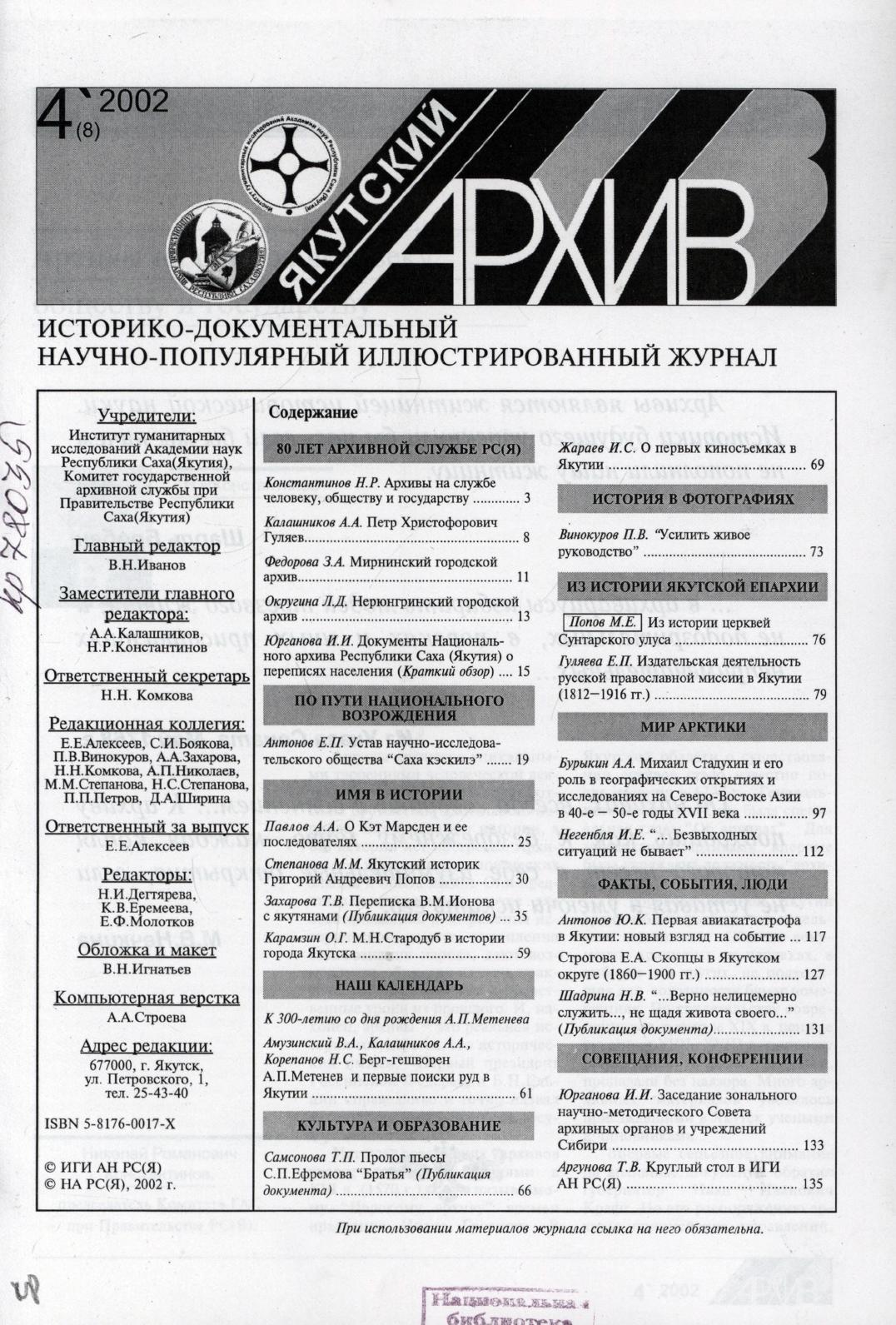 Якутский архив : историко-документальный научно-популярный иллюстрированный журнал / Главный редактор В. Н. Иванов. - Якутск : ИГИ АН РС (Я), 2000-.