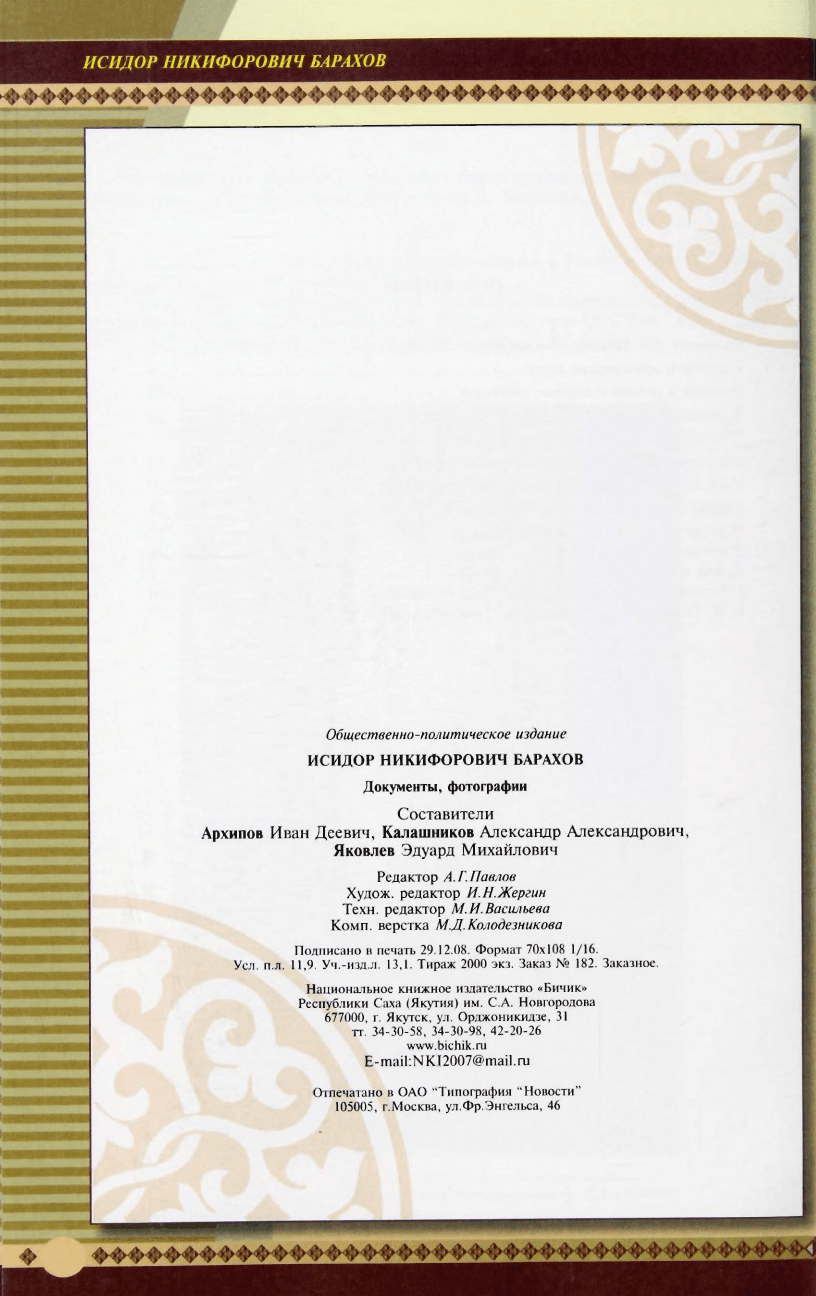 Исидор Никифорович Барахов (1898-1938) : фотографии, документы / Республиканский организационный комитет по подготовке и проведению 110-летнего юбилея И. Н. Барахова, ГУ "Национальный архив Республики Саха (Якутия)", ГУ "Якутский государственный объединенный музей истории и культуры народов Севера им. Е. М. Ярославского" ; [составители: И. Д. Архипов, А. А. Калашников, Э. М. Яковлев ; ответственный редактор А. С. Николаев ; научный редактор Ю. И. Васильев-Дьаргыстай ; фотографы: И. Д. Архипов, Ю. И. Васильев, П. С. Оконешников]. - Якутск : Бичик, 2009. - 135 с. : ил., портр. ).