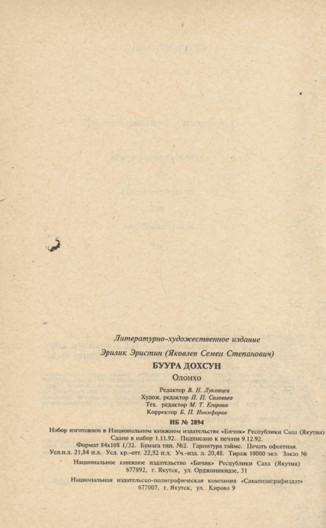 Творчество С. С. Яковлева - Эрилик Эристиина неразрывно связано с устнопоэтическим наследием народа. Им оставлены несколько олонхо в рукописном виде. Публикуемое первым из них "Буура Дохсун" отличает живописность, своеобразие, богатство языка и новизна сюжета