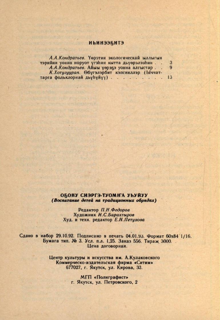 Оҕону сиэргэ-туомҥа уһуйуу / Саха Республикатын культураҕа министерствота, А. Кулаковскай аатынан культура уонна искусство киинэ. - Дьокуускай : Ситим, 1992. - 19, [1] с.
