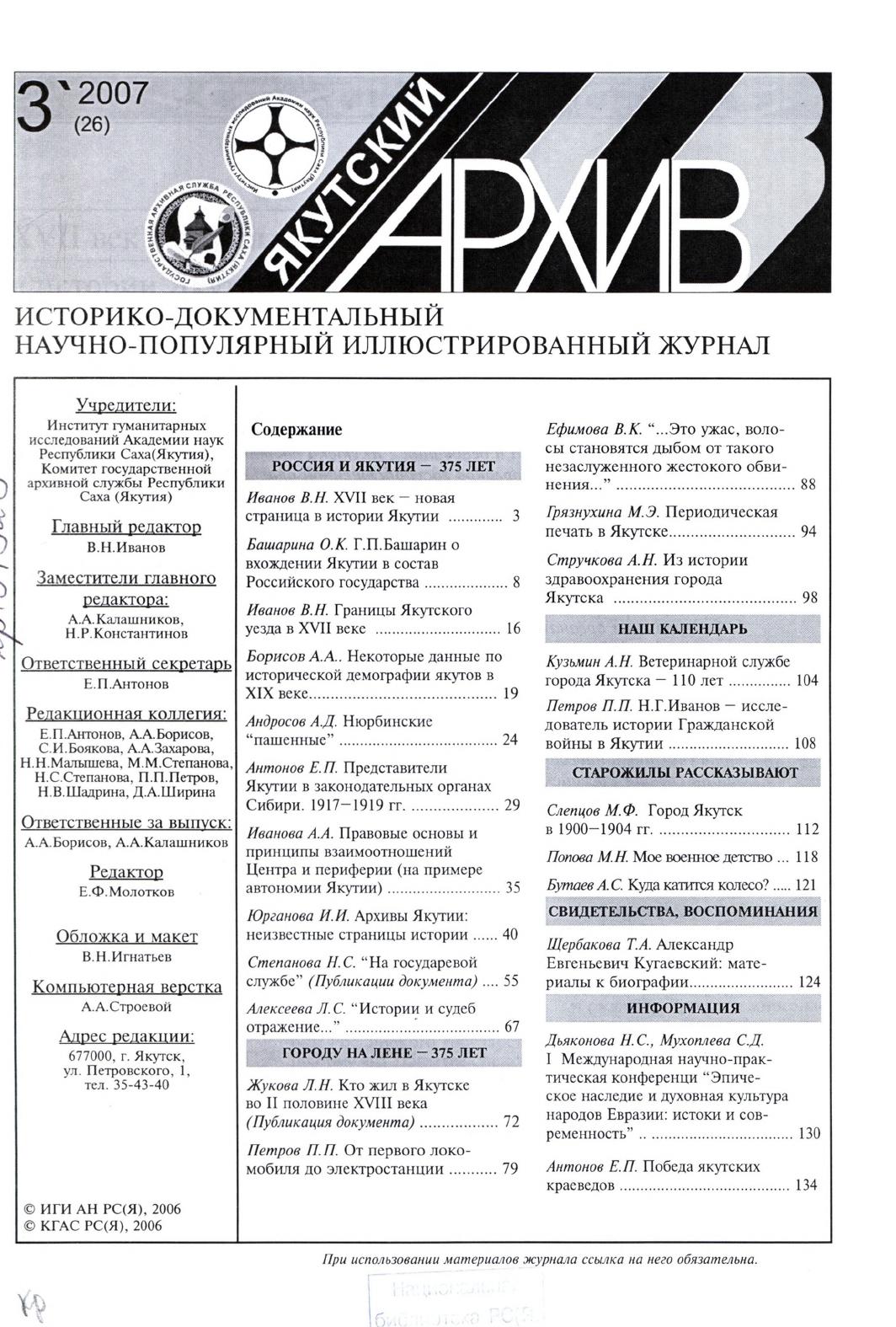 - Периодические издания Якутии (конец XIX – XXI вв.) > Журналы > Якутский архив > 2007,