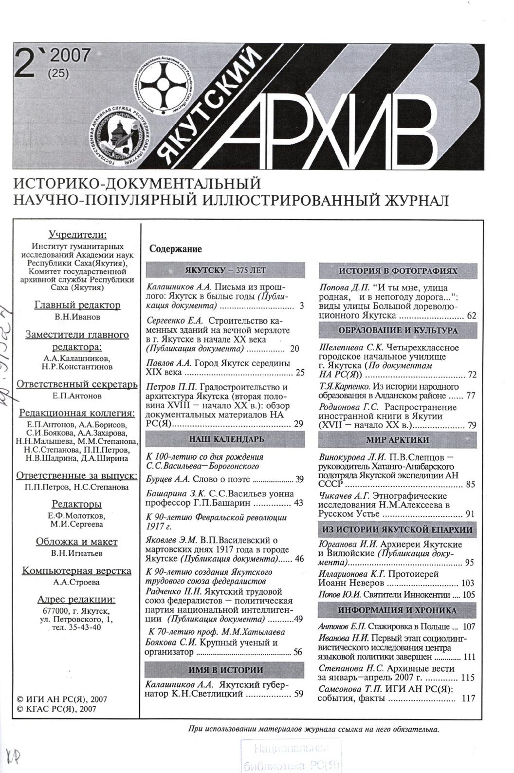 - Периодические издания Якутии (конец XIX – XXI вв.) > Журналы > Якутский архив > 2007,