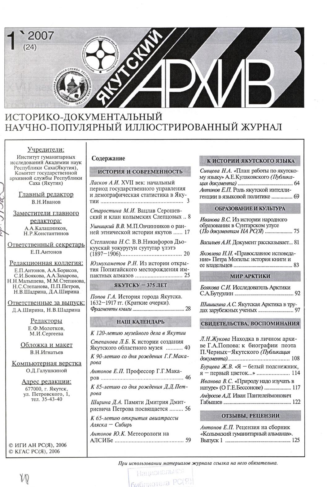 - Периодические издания Якутии (конец XIX – XXI вв.) > Журналы > Якутский архив > 2007,