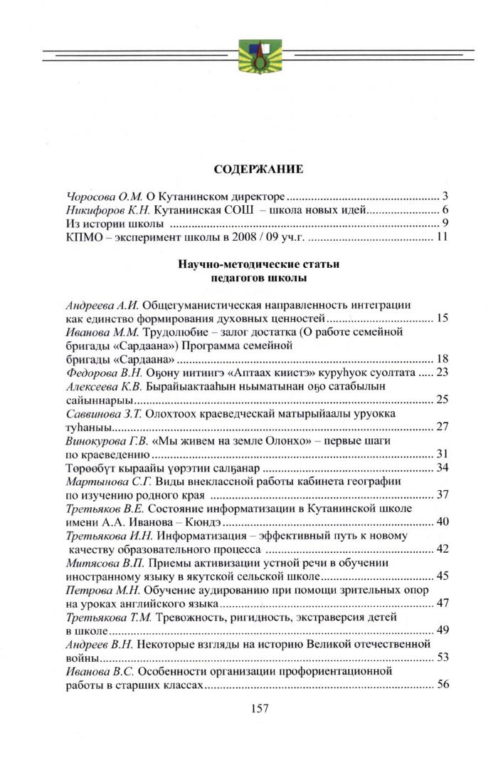 Школа новых идей : [сборник статей] / ГОУ "Институт повышения квалификации работников образования им. С. Н. Донского-II" РС(Я), МОУО "Сунтарский улус (район)", МОУ "Кутанинская СОШ им. А. А. Иванова-Кюндэ" ; [составитель И. Н. Третьякова]. - Якутск : Издательство ИПКРО, 2009. - 158, [1] с.