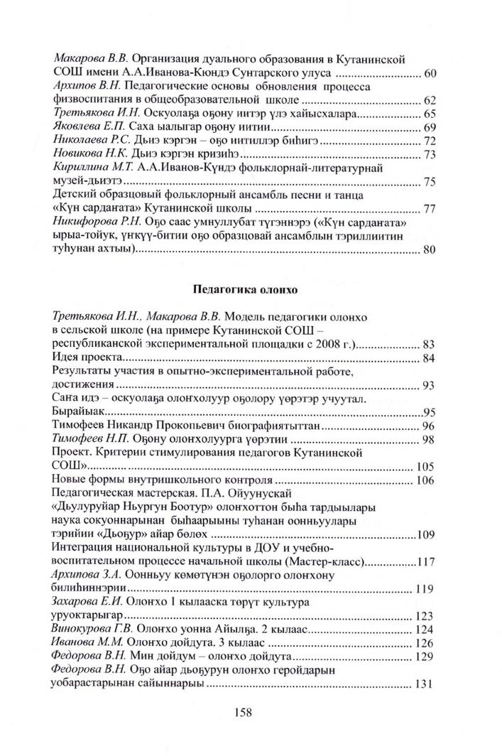 В публикуемом издании освещается опыт педагогического коллектива Кутанинской СОШ - центра инновационных начинаний в Сунтарском улусе - по реализации таких модернизационных проектов, как КПМО, НСОТ, дуальное образование, по внедрению ИКТ-технологий в образовательный процесс и др. Интерес читателей привлекут статьи по вопросам семьи, семейного воспитания и о путях преодоления семейного кризиса. Особого внимания заслуживает описанный эксперимент по изучению и применению в учебно-воспитательном процессе педагогики олонхо