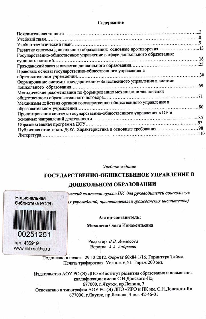 Государственно-общественное управление в дошкольном образовании : (учебно-методический комплект курсов ПК для руководителей дошкольных образовательных учреждений, представителей гражданских институтов) / АОУ РС(Я) ДПО "Институт развития образования и повышения квалификации им. С. Н. Донского-II" ; [автор-составитель кандидат педагогических наук О. И. Михалева ; научный руководитель доктор педагогических наук Г. И. Алексеева]. - Якутск : Издательство ИРОиПК, 2012. - 111 с.