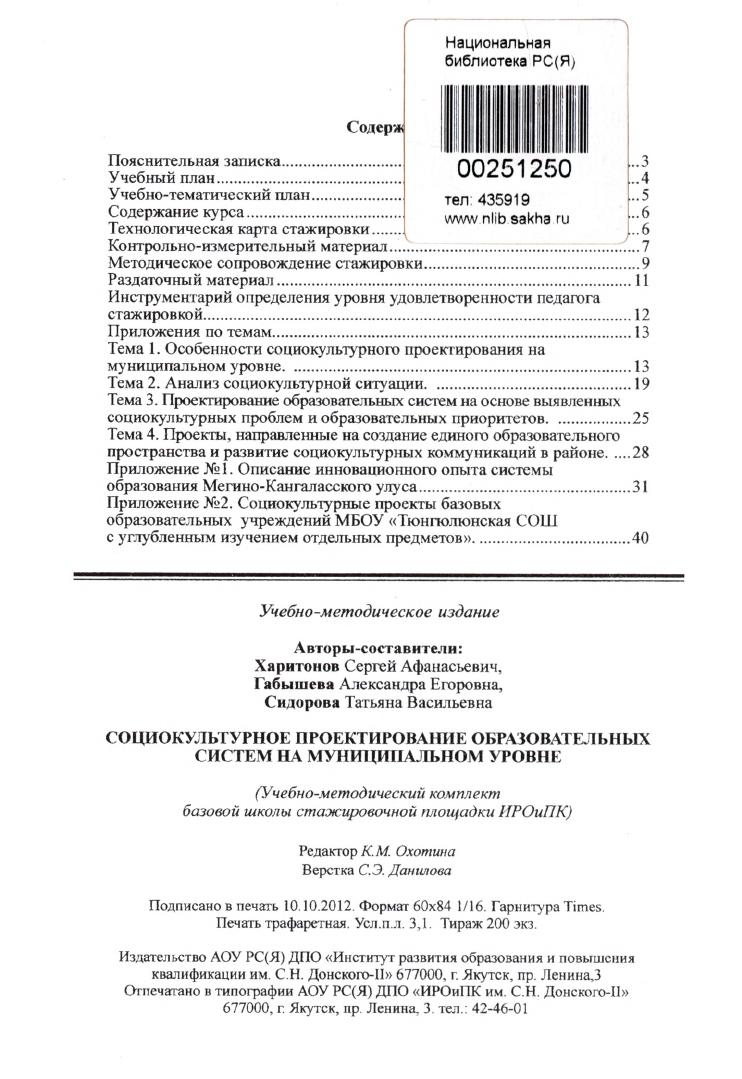 Социокультурное проектирование образовательных систем на муниципальном уровне : (учебно-методический комплект базовой школы стажировочной площадки ИРОиПК) / АОУ РС(Я) ДПО "Институт развития образования и повышения квалификации им. С. Н. Донского-II", МКУ "Мегино-Кангаласское районное управление образованием" ; [автор-составитель: С. А. Харитонов, А. Е. Габышева, Т. В. Сидорова ; научный руководитель доктор педагогических наук Г. И. Алексеева]. - Якутск : ИРОиПК, 2012. - 50, [2] с.