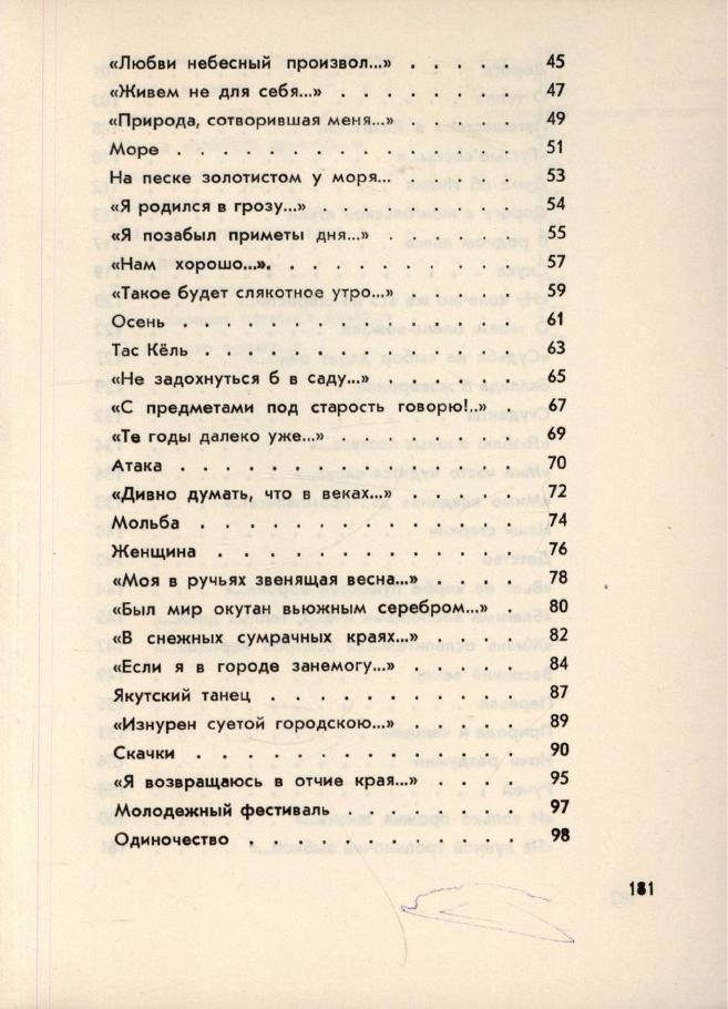 Когда читаешь стихи известного поэта Семена Данилова, лауреата премии имени А. М. Горького, испытываешь радость сопереживания. Вместе с поэтом читатель раздумывает над прекрасными переменами в жизни якутского народа, над успехами и новыми задачами в жизни «алмазной Якутии». С особой сердечностью звучат стихи о природе, о зрелом, сложившемся чувстве любви и дружбы. Примечательны стихи о судьбах родного языка, о влиянии гения Пушкина на родную культуру